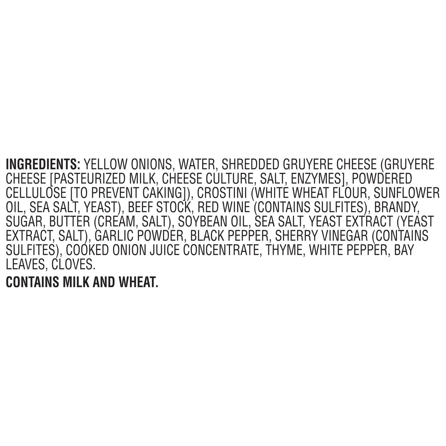 Yellow Onions, Water, Shredded Gruyere Cheese (gruyere cheese [pasteurized milk, cheese culture, salt, enzymes], powdered cellulose [to prevent caking]), Crostini (Enriched Flour [Wheat Flour, Malted Barley Flour, Niacin, Reduced Iron, Thiamine Mononitrate, Riboflavin, Folic Acid], Cultured Wheat Flour, Sunflower Oil, Sea Salt), Beef Stock, Red Wine (contains sulfites), Brandy, Sugar, Butter (cream, salt), Soybean Oil, Sea Salt, Yeast Extract (yeast extract, salt), Garlic Powder, Black Pepper, Sherry Wine Vinegar (contains sulfites), Cooked Onion Juice Concentrate, Thyme, White Pepper, Bay Leaves, Cloves.