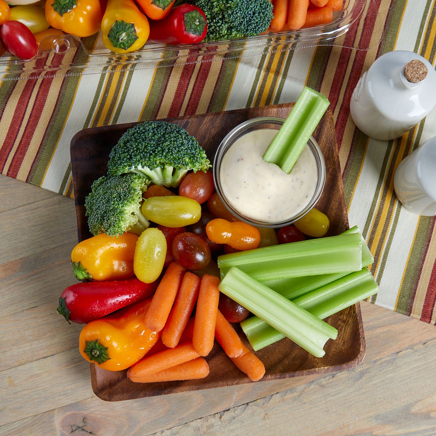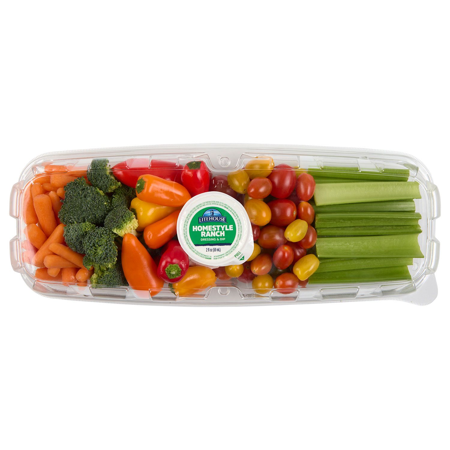 Our vegetable tray comes with two containers of Litehouse Homestyle ranch dressing. However, these veggies also pair well with other dips like hummus and honey mustard. Feel free to mix it up and add your own dips to the veggie tray for a personalized touch.