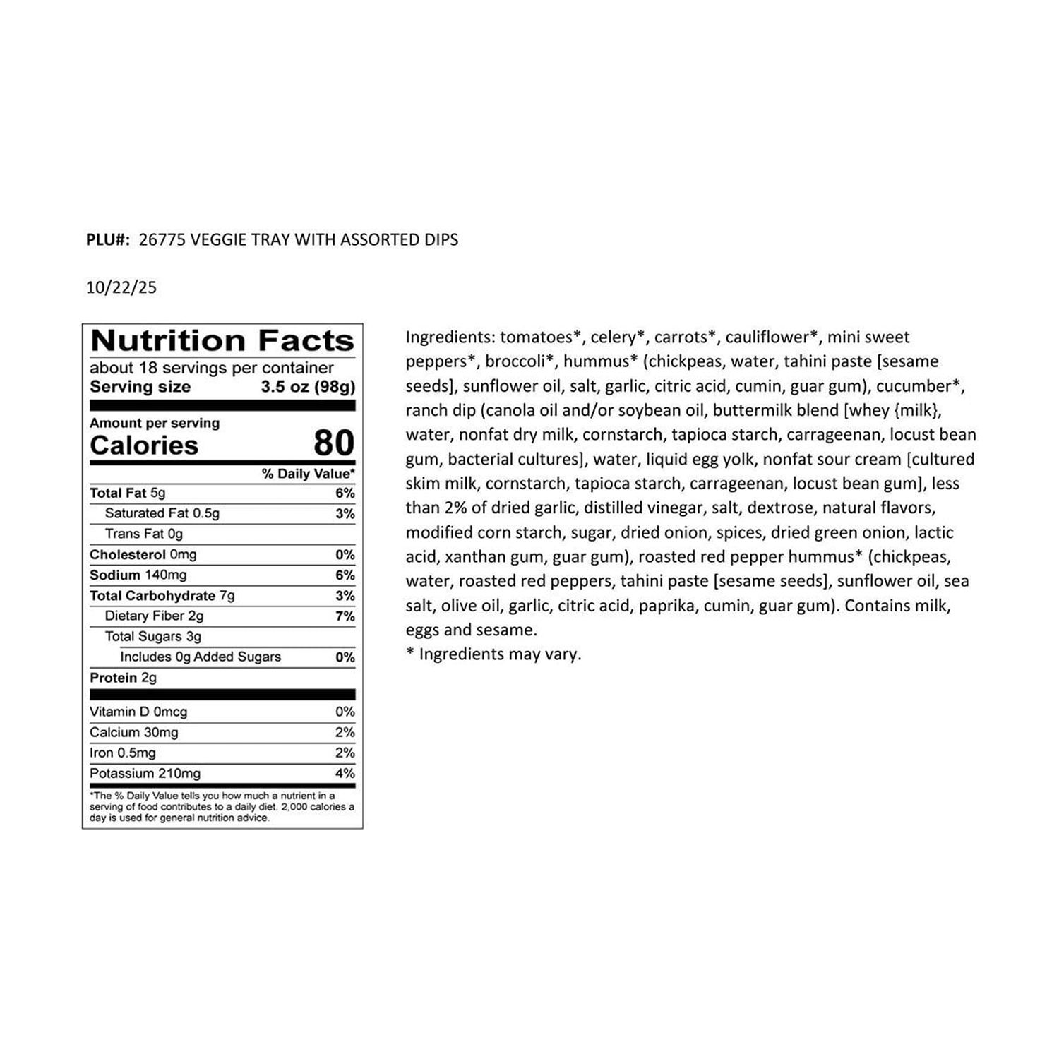 Ingredients: Tomatoes*, Celery*, Carrots*, Cauliflower*, Mini Sweet Peppers*, Broccoli*, Hummus* (Chickpeas, Water, Tahini Paste [Sesame Seeds], Sunflower Oil, Salt, Garlic, Citric Acid, Cumin, Guar Gum), Cucumber*, Ranch Dip (Canola Oil And/Or Soybean Oil, Buttermilk Blend [Whey {Milk}, Water, Nonfat Dry Milk, Cornstarch, Tapioca Starch, Carrageenan, Locust Bean Gum, Bacterial Cultures], Water, Liquid Egg Yolk, Nonfat Sour Cream [Cultured Skim Milk, Cornstarch, Tapioca Starch, Carrageenan, Locust Bean Gum], Less Than 2% Of Dried Garlic, Distilled Vinegar, Salt, Dextrose, Natural Flavors, Modified Corn Starch, Sugar, Dried Onion, Spices, Dried Green Onion, Lactic Acid, Xanthan Gum, Guar Gum), Roasted Red Pepper Hummus* (Chickpeas, Water, Roasted Red Peppers, Tahini Paste [Sesame Seeds], Sunflower Oil, Sea Salt, Olive Oil, Garlic, Citric Acid, Paprika, Cumin, Guar Gum).
