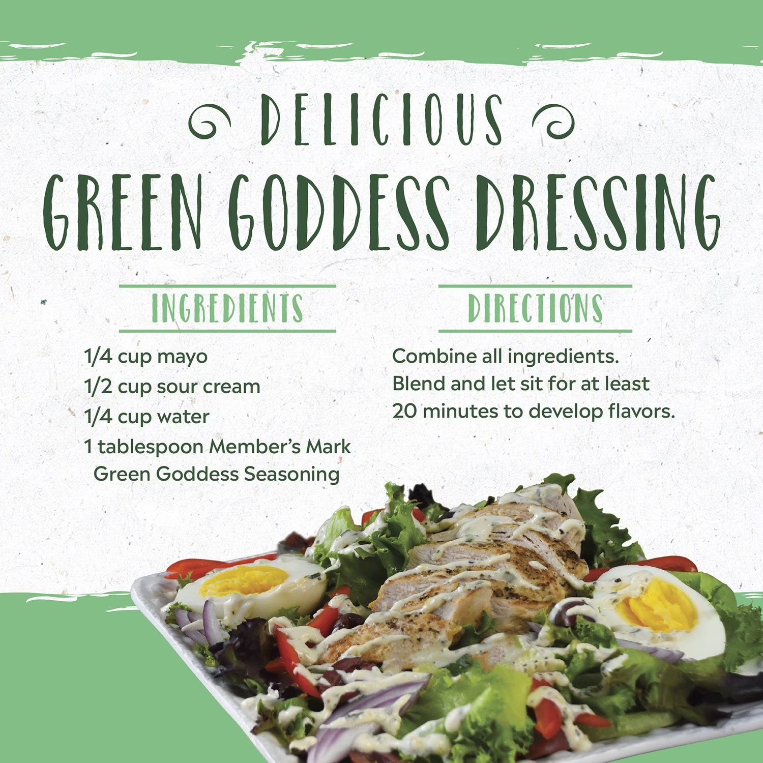 Experience the captivating taste of Member's Mark™ Green Goddess Seasoning—a savory and herbaceous combination featuring dried onion, garlic, and a touch of zesty lemon. Elevate your dishes with this thoughtfully crafted blend, infusing them with a vibrant and fresh flavor profile. Use it to enhance a variety of dishes, from roasted vegetables and grilled chicken to seafood and salads, unlocking new levels of delicious flavor in your culinary creations.