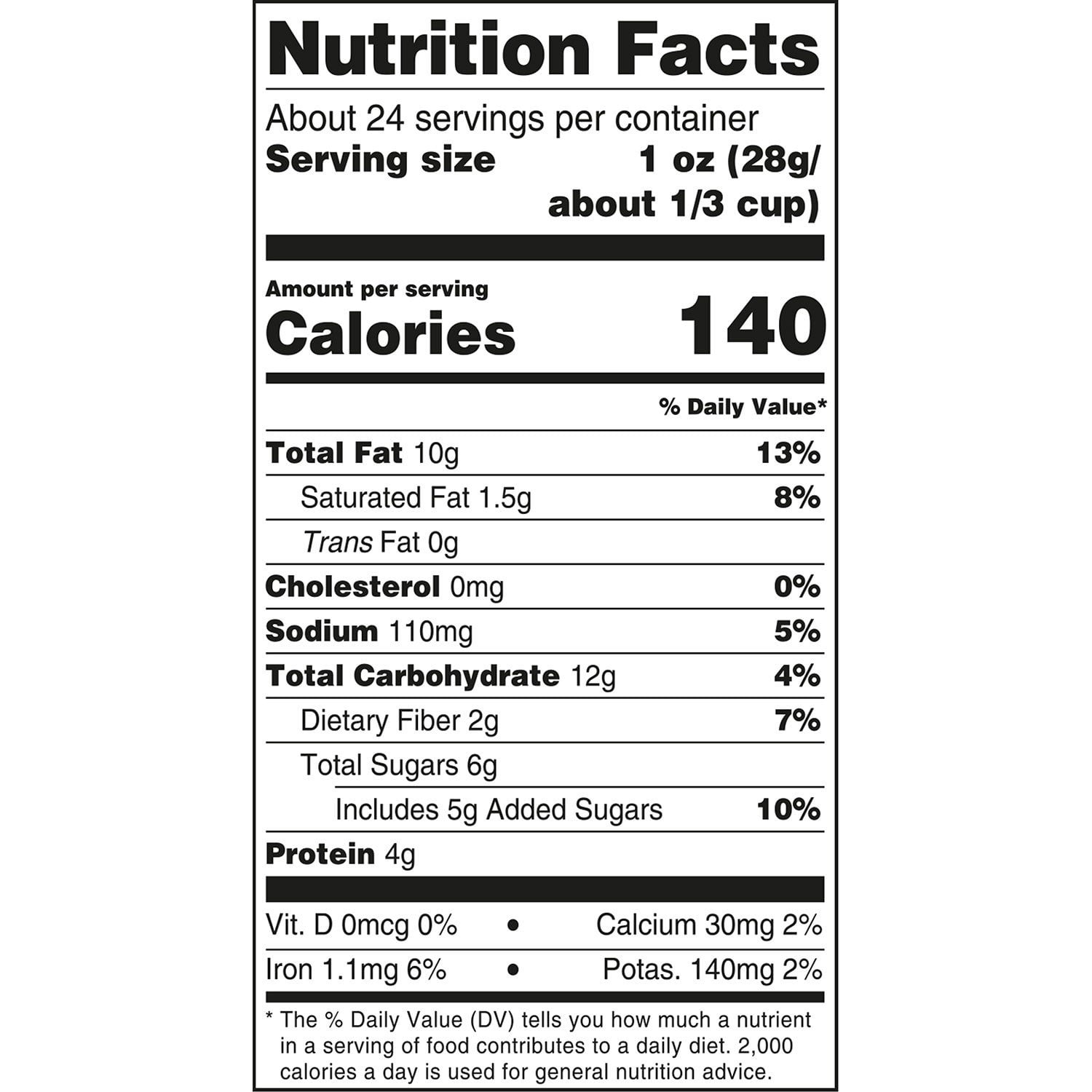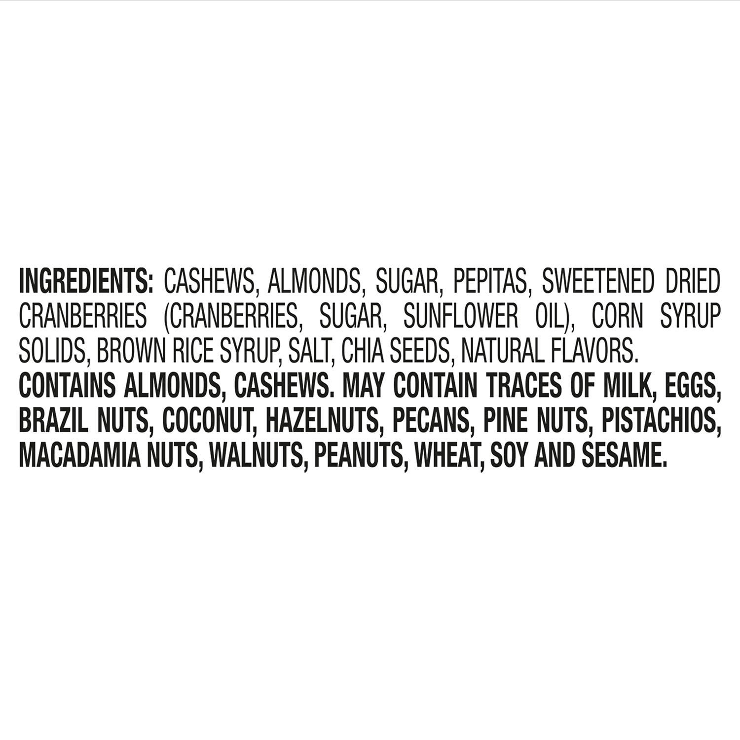 Ingredients: Cashews, Almonds, Sugar, Pepitas, Sweetened Dried Cranberries (Cranberries, Sugar, Sunflower Oil), Corn Syrup Solids, Brown Rice Syrup, Salt, Chia Seeds, Natural Flavors.
