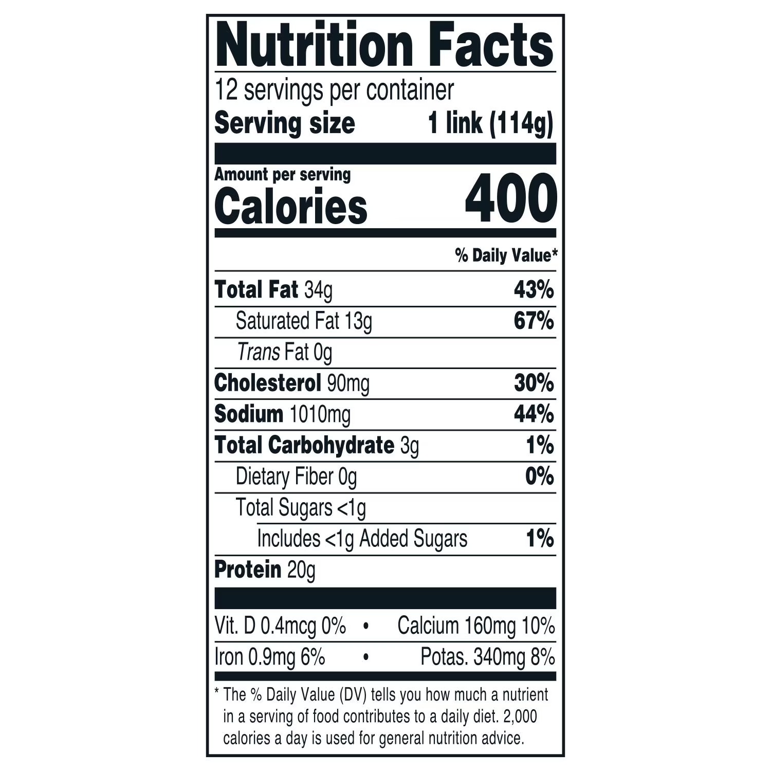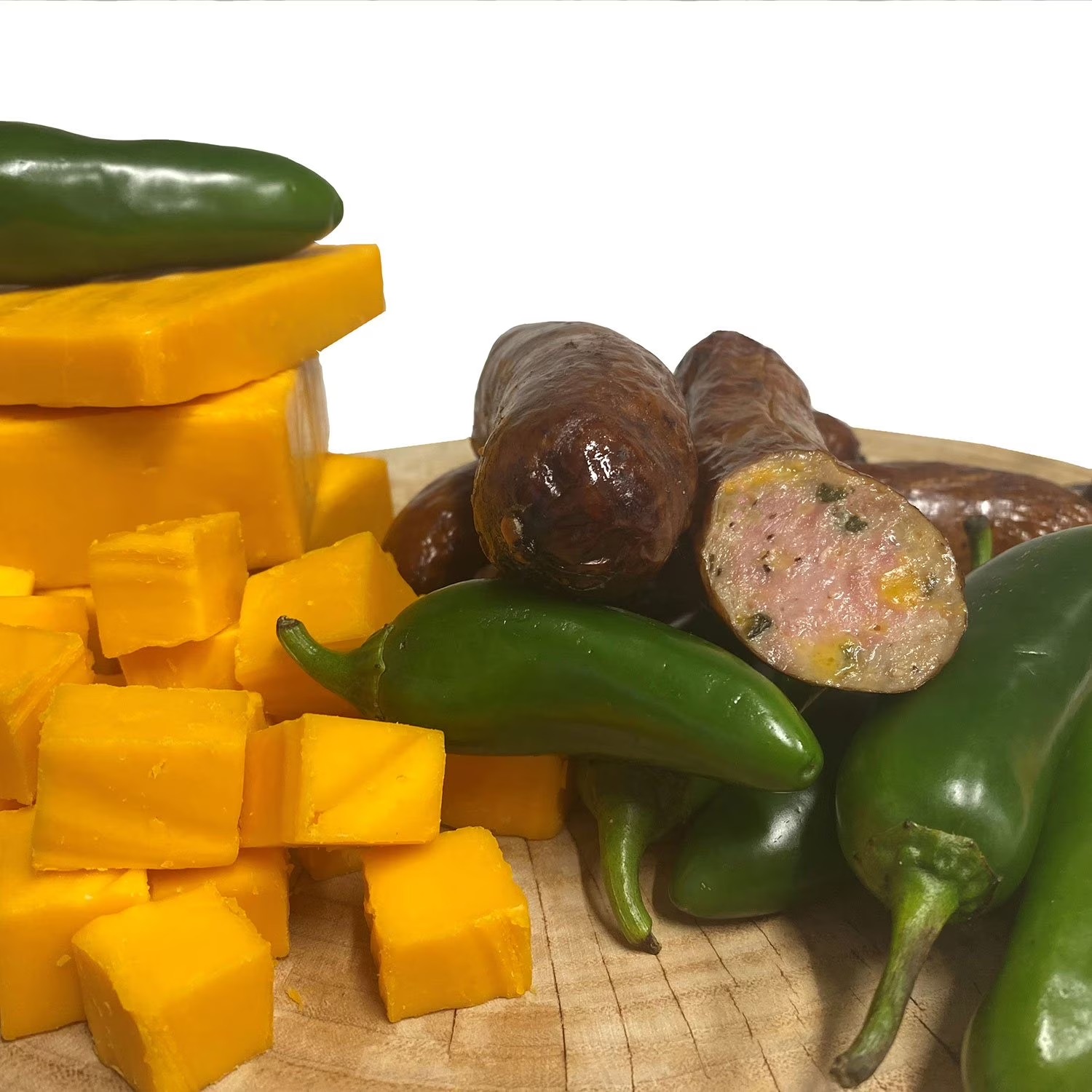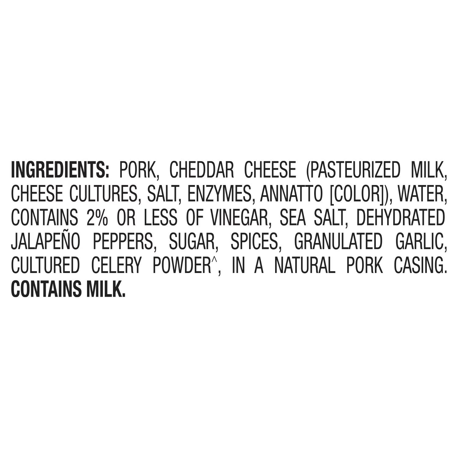 Ingredients: Pork, cheddar cheese, water, contains 2% or less of vinegar, sea salt, dehydrated jalapeno peppers, sugar, spices, granulated garlic, cultured celery powder, in a natural pork casing