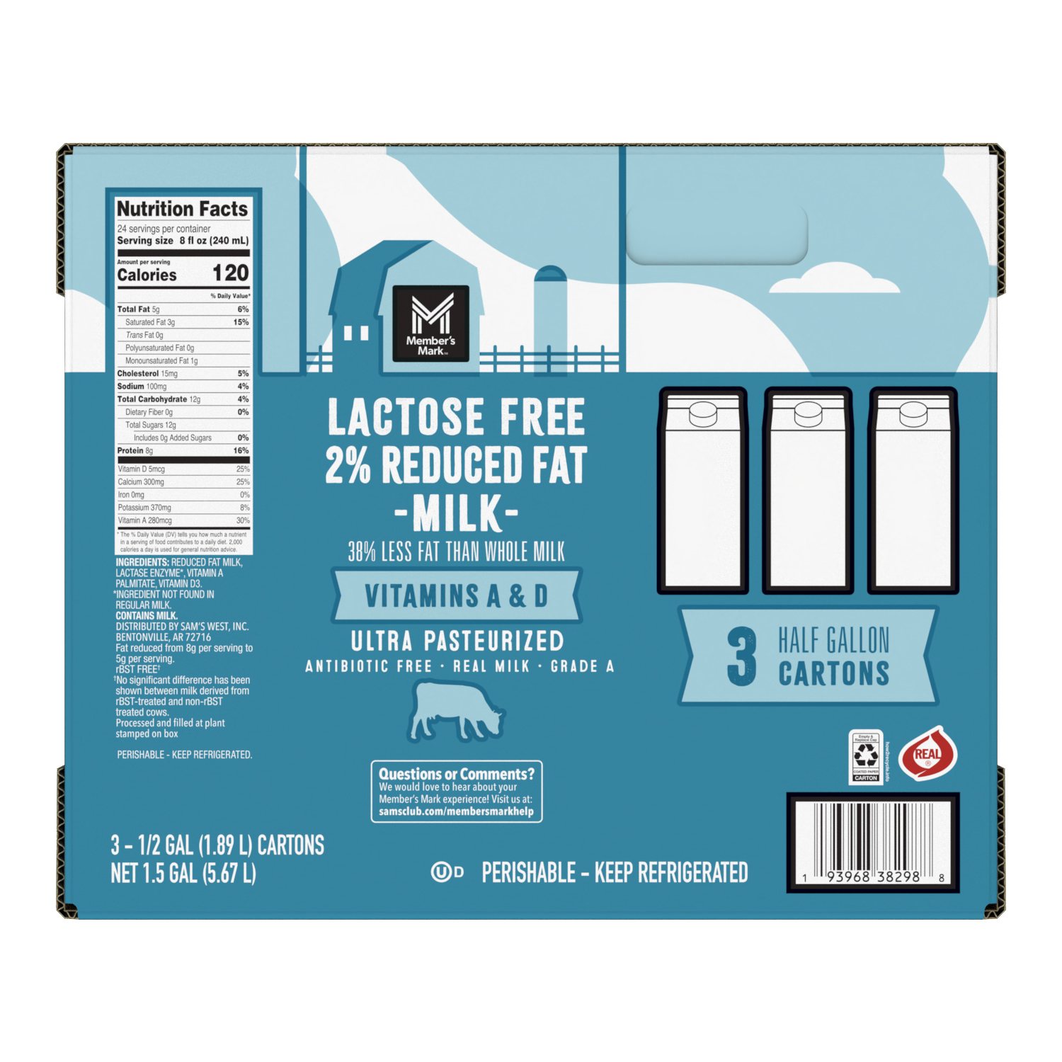 This lactose free milk is packed with vitamins and minerals. It's an excellent source of calcium, a good source of protein, vitamins A and D, and is certified kosher. Member's Mark Lactose Free 2% Reduced Fat Milk, 64 fl. oz., 3 pk. comes in a three-pack so you can easily store and enjoy. Use within seven days of opening and keep refrigerated.