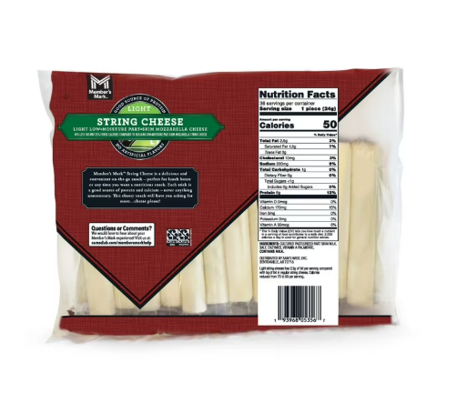 Our new Member’s Mark Light String Cheese is creamy, stringy and delicious. You will not be disappointed. This string cheese delivers a high-quality eating experience at a great price. Save money while savoring your favorite snack. At 50% less fat than regular string cheese, get all the flavor with none of the guilt!