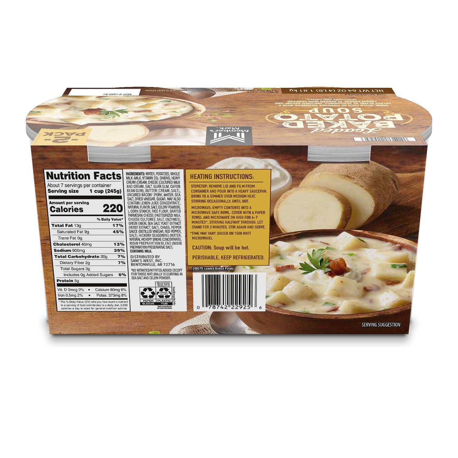 When you're craving a warm, satisfying meal, Member's Mark Loaded Baked Potato Soup, 32 oz., 2 pk. is the answer. Preparing this delightful soup is a breeze—just heat it up on the stovetop or in the microwave, and in no time, you'll have a delicious dish that's sure to please everyone at the table. Keep a pack in your pantry for those days when you need a little comfort food to warm your heart and soul!