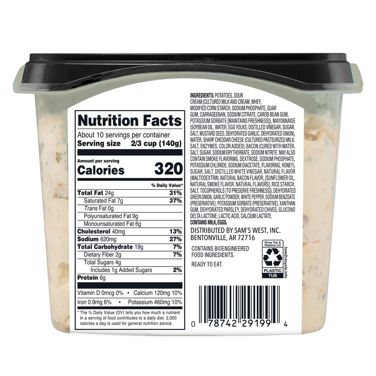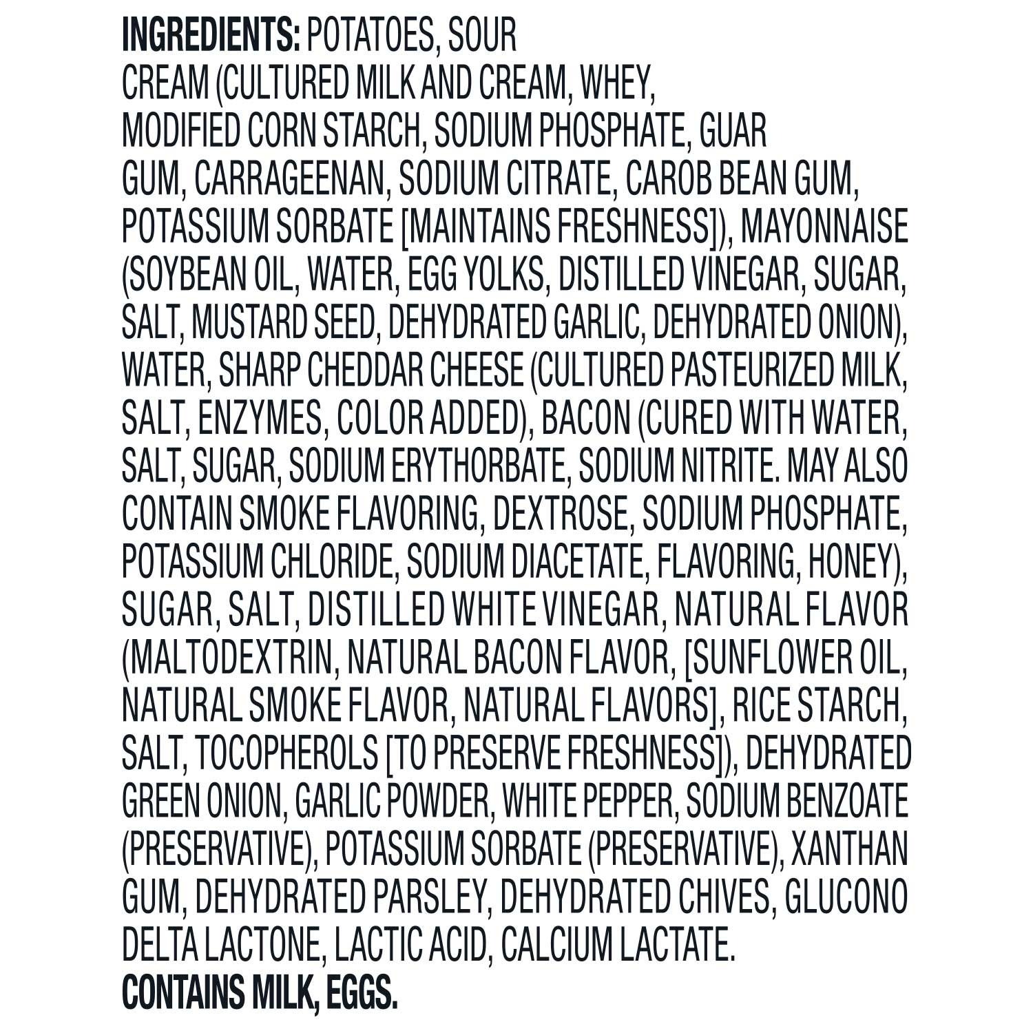 Idaho Potatoes, Sour Cream (Cultured Milk and Cream, Whey, Modified Corn Starch, Sodium Phosphate, Guar Gum, Carrageenan, Sodium Citrate, Carob Bean Gum, Potassium Sorbate (Maintains Freshness)), Mayonnaise (Soybean Oil, Water, Egg Yolk, Distilled Vinegar, Sugar, Salt, Mustard Seed, Dehydrated Garlic, Dehydrated Onion), Water, Sharp Cheddar Cheese (Cultured Pasteurized Milk, Salt, Enzymes, Annatto Extract Color), Bacon (Cured with Water, Salt, Sugar, Sodium Erythorbate, Sodium Nitrite. May Also Contain Smoke Flavoring, Honey), Sugar, Salt, Distilled White Vinegar, Dehydrated Green Onion, Garlic Powder, White Pepper, Sodium Benzoate (Preservative), Potassium Sorbate (Preservative), Xanthan Gum, Dehydrated Parsley, Dehydrated Chives, Glucono Delta Lactone, Lactic Acid.