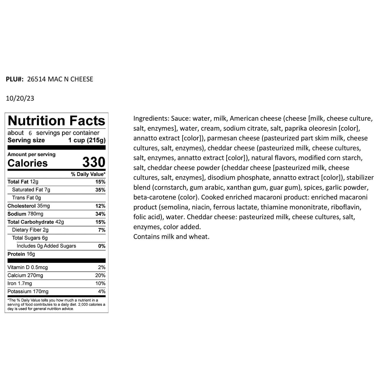 | Ingredients: | Sauce: Water, Milk, American Cheese (Cheese [Milk, Cheese Culture, Salt, Enzymes], Water, Cream, Sodium Citrate, Salt, Paprika Oleoresin [Color], Annatto Extract [Color]), Parmesan Cheese (Pasteurized Part Skim Milk, Cheese Cultures, Salt, Enzymes), Cheddar Cheese (Pasteurized Milk, Cheese Cultures, Salt, Enzymes, Annatto Extract [Color]), Natural Flavors, Modified Corn Starch, Salt, Cheddar Cheese Powder (Cheddar Cheese [Pasteurized Milk, Cheese Cultures, Salt, Enzymes], Disodium Phosphate, Annatto Extract [Color]), Stabilizer Blend (Cornstarch, Gum Arabic, Xanthan Gum, Guar Gum), Spices, Garlic Powder, Beta-carotene (Color). Cooked Enriched Macaroni Product: Enriched Macaroni Product (Semolina, Niacin, Ferrous Lactate, Thiamine Mononitrate, Riboflavin, Folic Acid), Water. Cheddar Cheese: Pasteurized Milk, Cheese Cultures, Salt, Enzymes, Color Added. |