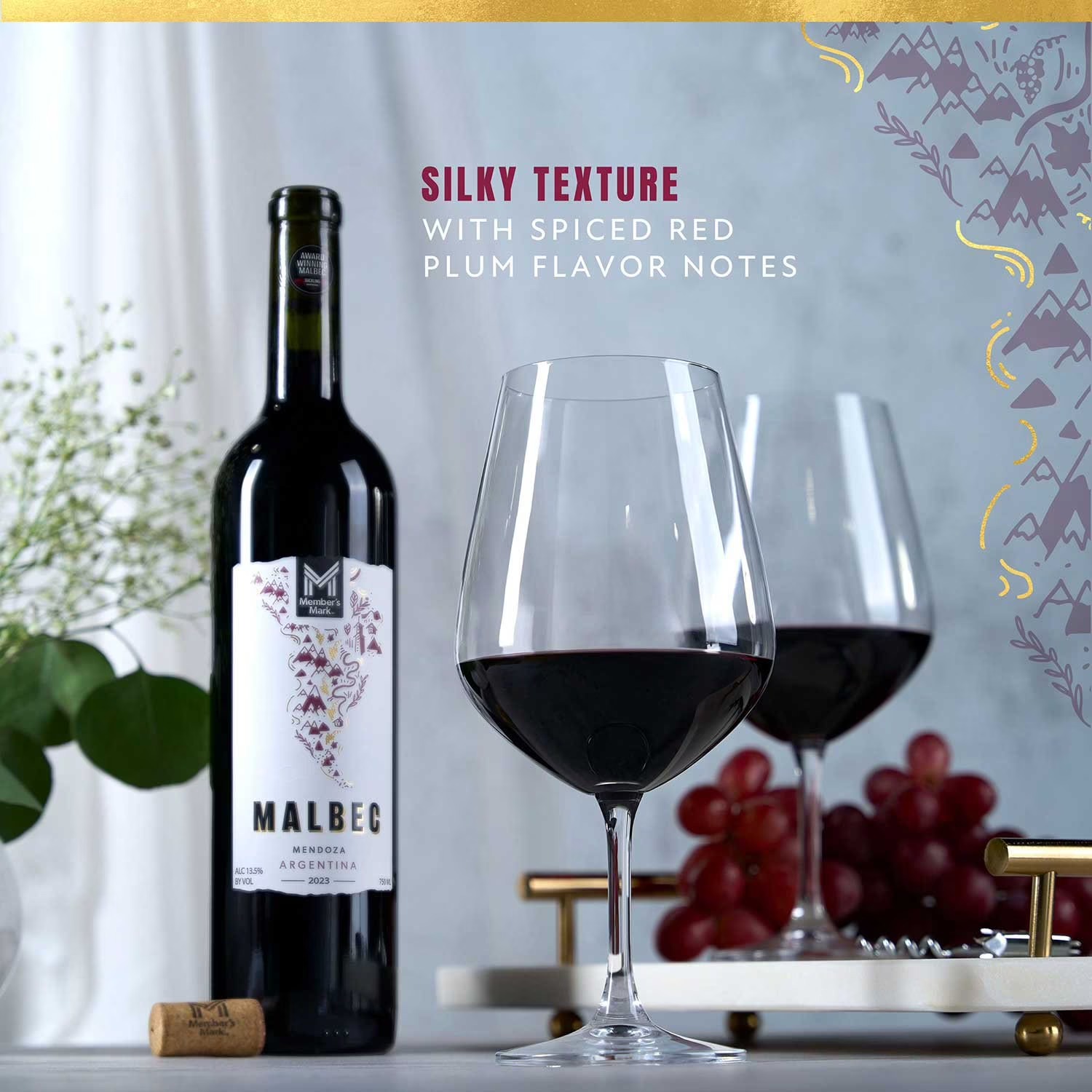 Situated at the foothills of the Andes and fed by the purest water from melted snow, the vineyards that produce Member's Mark Malbec are renown for growing grapes of outstanding quality. This wine brings the robust feel of a traditional malbec, with spiced red plum flavors backed by a silky texture. It's as elegant as it is complex, yet it pairs perfectly with most cuisine.