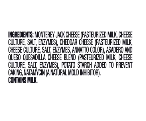 Ingredients: monterey jack cheese (pasteurized milk, cheese culture, salt, enzymes), cheddar cheese (pasteurized milk, cheese culture, salt, enzymes, annatto [color]), asadero and queso quesadilla cheese blend (pasteurized milk, cheese culture, salt, enzymes), potato starch added to prevent caking, natamycin (a natural mold inhibitor)