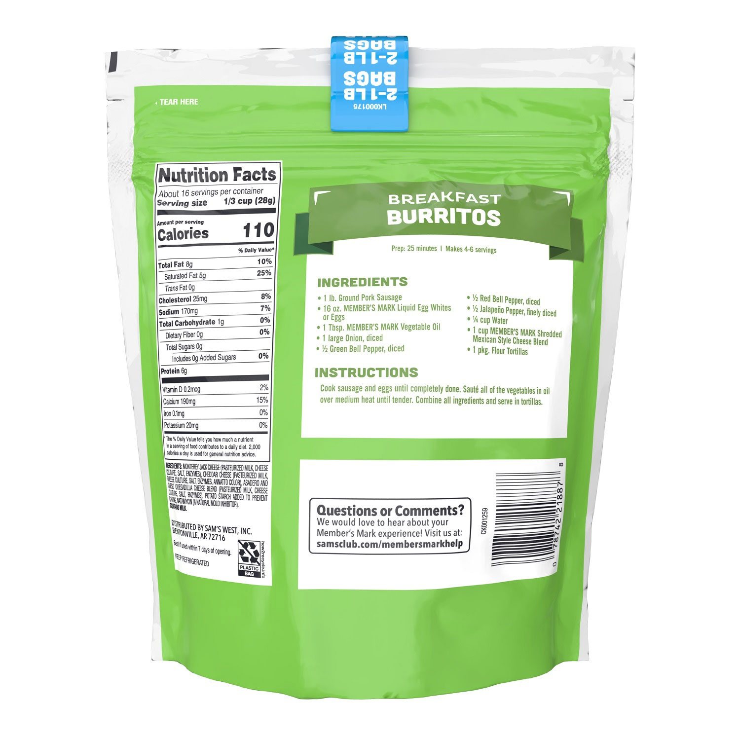Member's Mark Mexican Style Cheese Blend includes Monterey Jack, Cheddar, Queso Quesadilla and Asadero natural cheeses that are finely shredded for your convenience. This delicious blend of natural cheese is great for restaurants as well as personal use. Packaged into two individual resealable bags that contain four cups of shredded cheese each makes them ideal for multiple uses while maintaining freshness. Our high-quality, great-tasting blend works well with your recipes or as a topping for most foods. Use it to add a creamy, smooth flavor to dishes like nachos, quesadillas and fajitas.