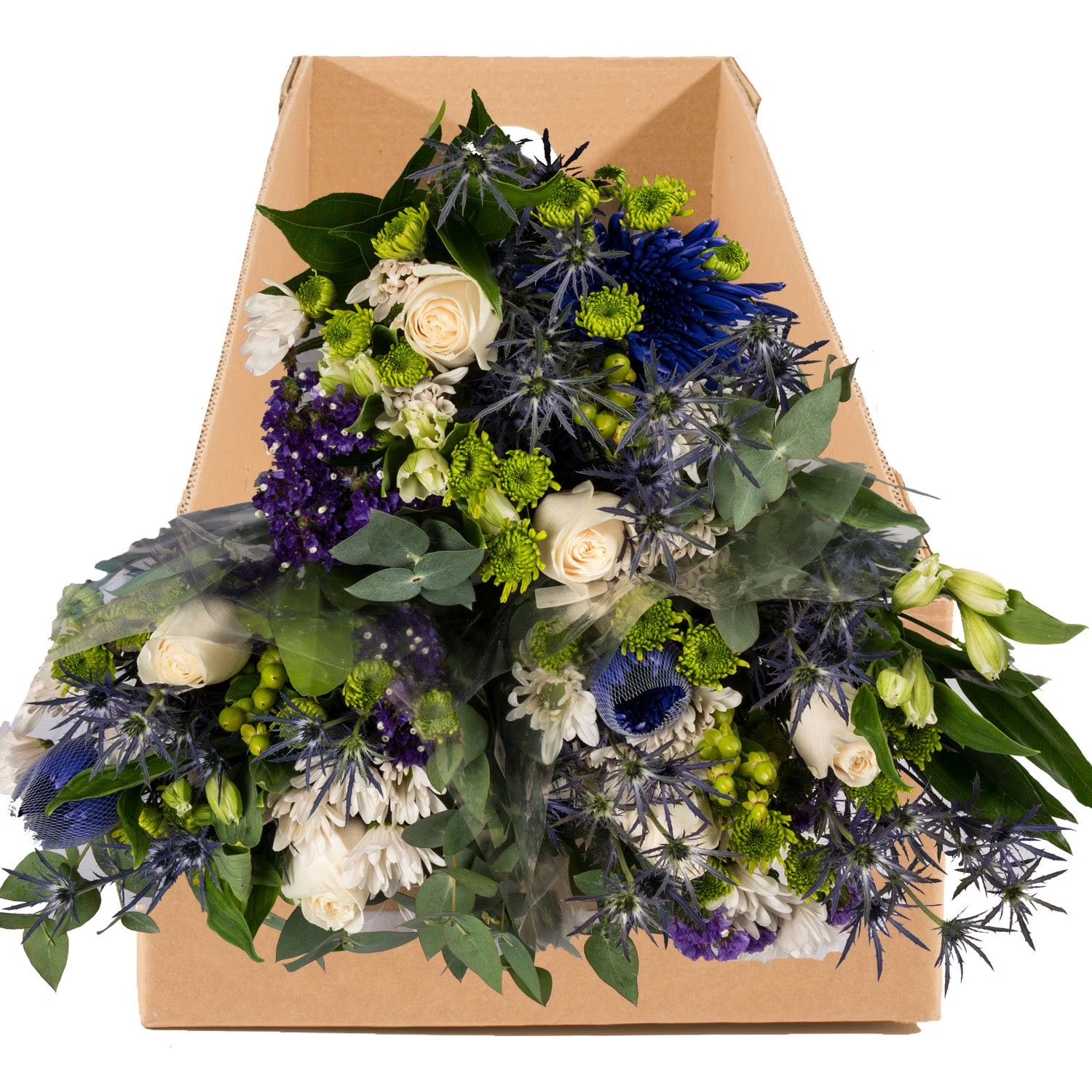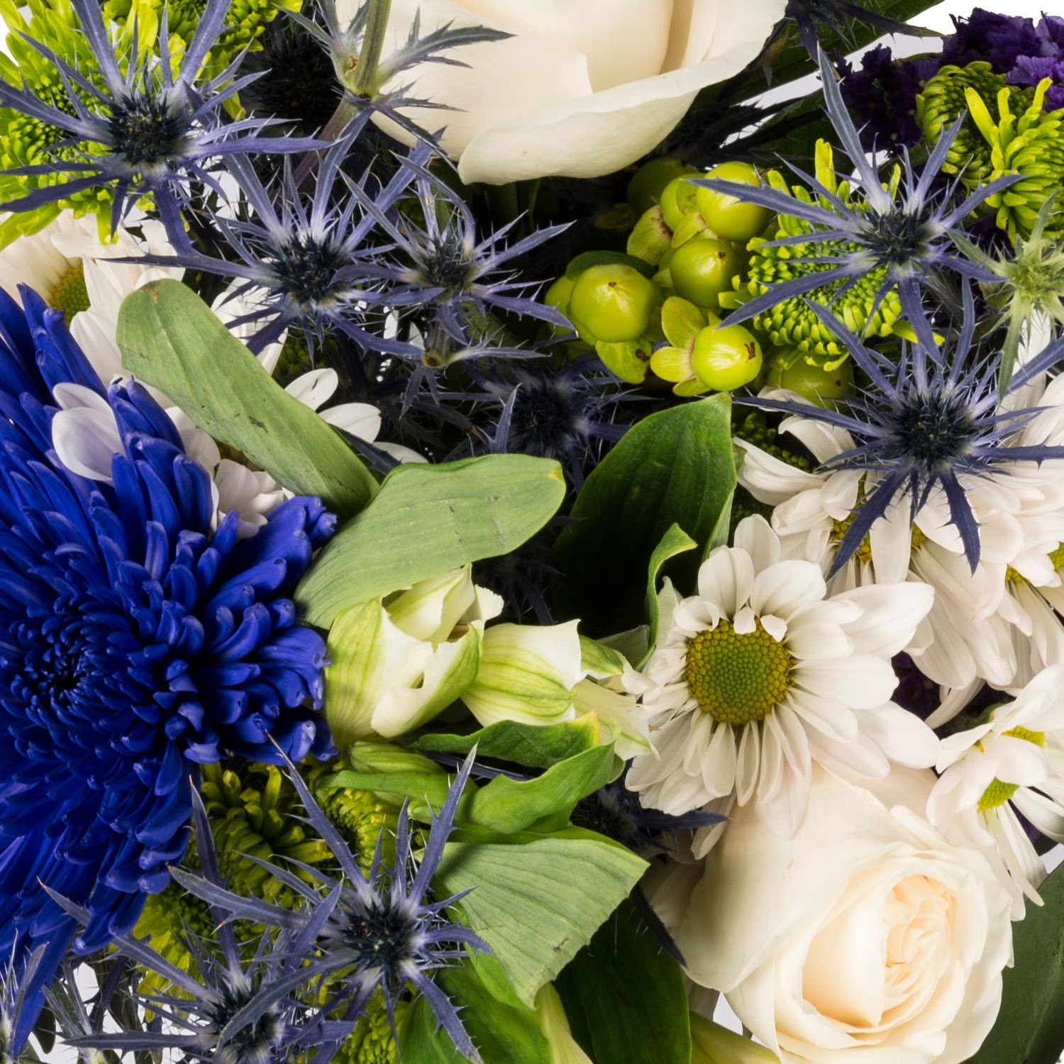 Imagine a canvas painted with stunning hues. These bouquets bring together a variety of nature's treasures, from vibrant eryngium to the elegance of white daisy poms. It's like a stroll through a garden bursting with life.