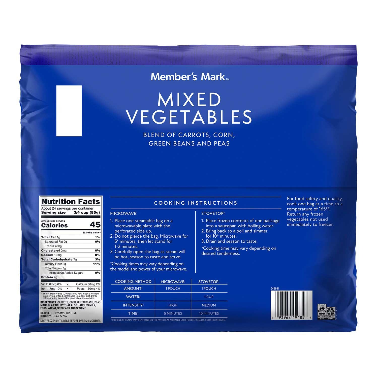 Enjoy the perfect blend of diced carrots, corn, cut green beans, and peas with Member's Mark Mixed Vegetables. Grown, harvested, and frozen to ensure optimum quality and freshness, these vegetables are a versatile addition to your meals.