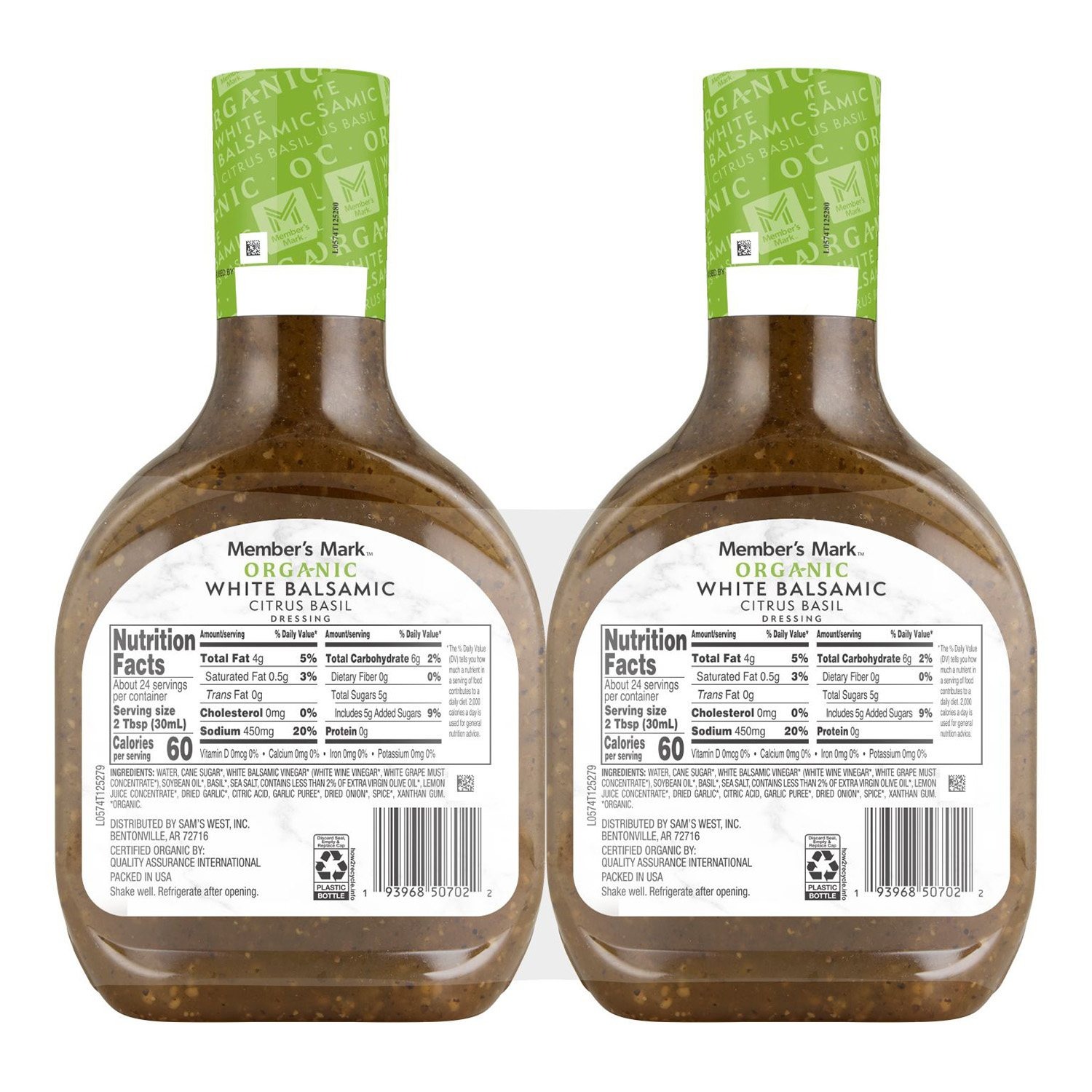 Bring home the fresh, zesty taste of Member’s Mark Organic White Balsamic Citrus Basil Dressing today. Add this two-pack to your cart now and discover why this is the must-have finishing touch for salads, pastas, and grilled favorites.