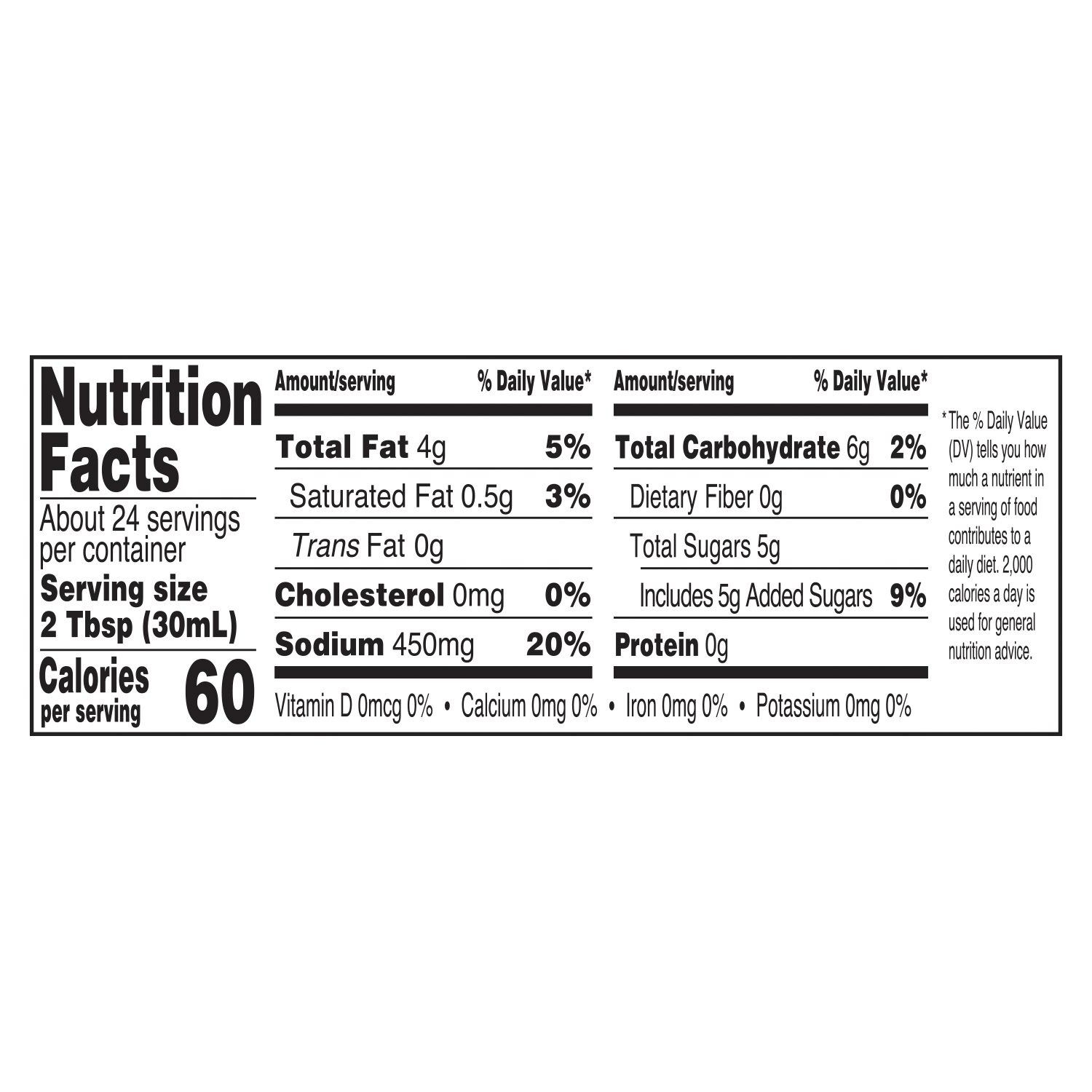 Ingredients: water, cane sugar*, white balsamic vinegar* (white wine vinegar*, white grape must concentrate*), soybean oil*, basil*, sea salt, contains less than 2% of extra virgin olive oil*, lemon juice concentrate*, dried garlic*, citric acid, garlic puree*, dried onion*, spice*, xanthan gum. *organic