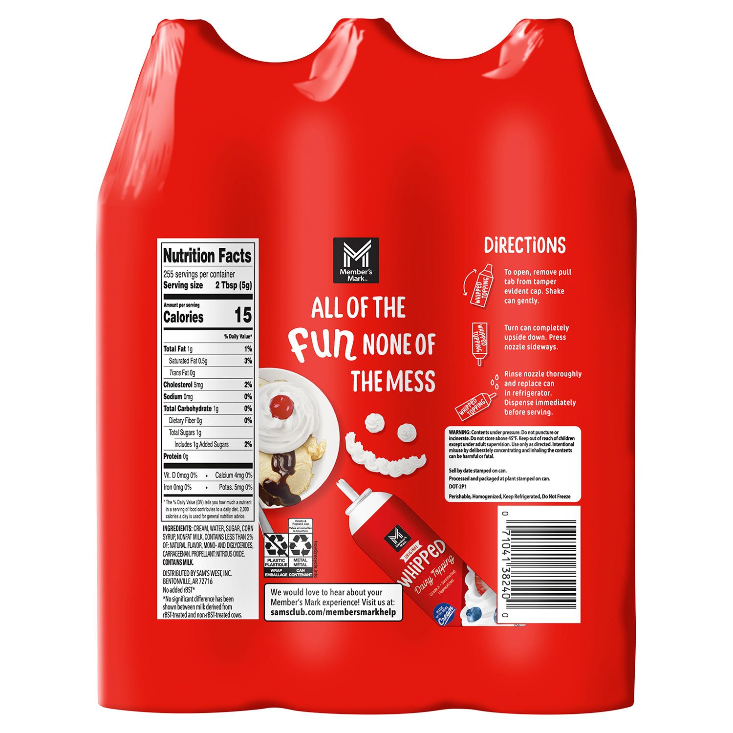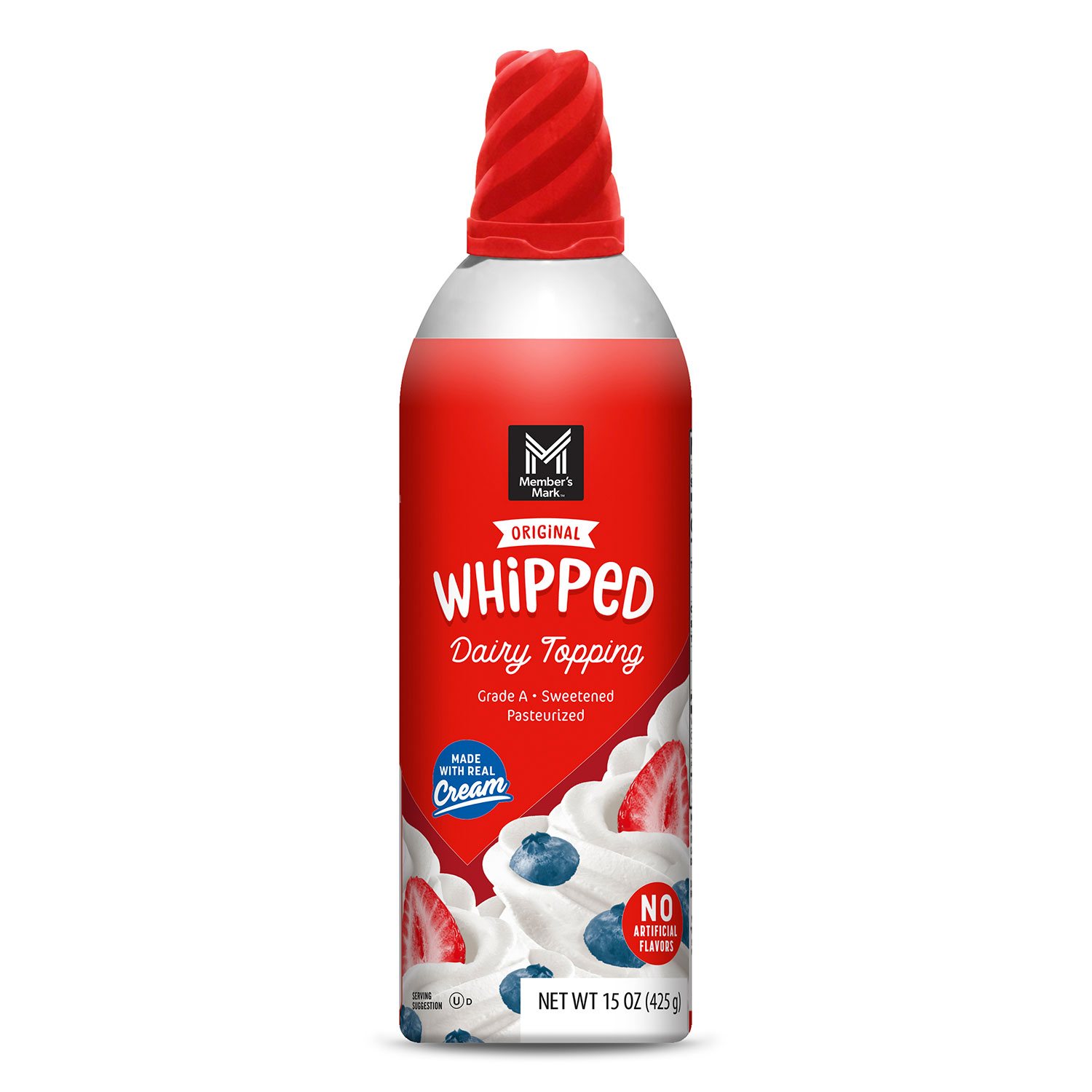 Member's Mark™ Original Dairy Whipped Topping goes great on just about anything. Sure, you could make whipped topping at home but we saved you extra steps—and not to mention, mess—so you can focus on enjoying your food. Just gently shake the can, turn it upside down and press the easy spray nozzle sideways to release. Then enjoy your favorite treats to the very last bite topped with this delicious, fluffy cream. This grade A, sweetened, pasteurized whipped cream contains no artificial flavors, is kosher certified, and has only about 15 calories per two tbsp serving.