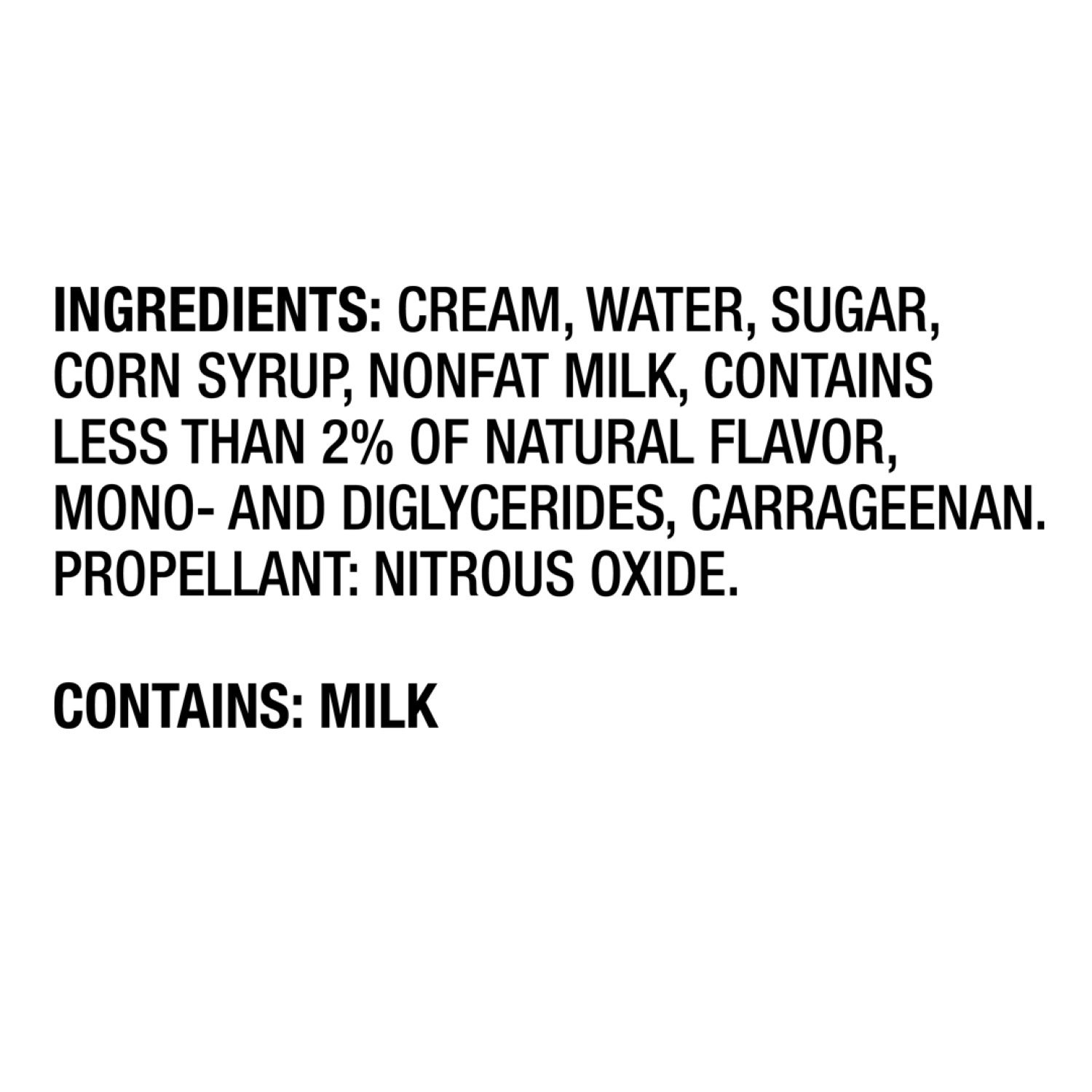 Ingredients: Cream, water, sugar, corn syrup, nonfat milk, contains less than 2% of: natural flavor, mono- and diglycerides, carrageenan. Propellant: nitrous oxide.