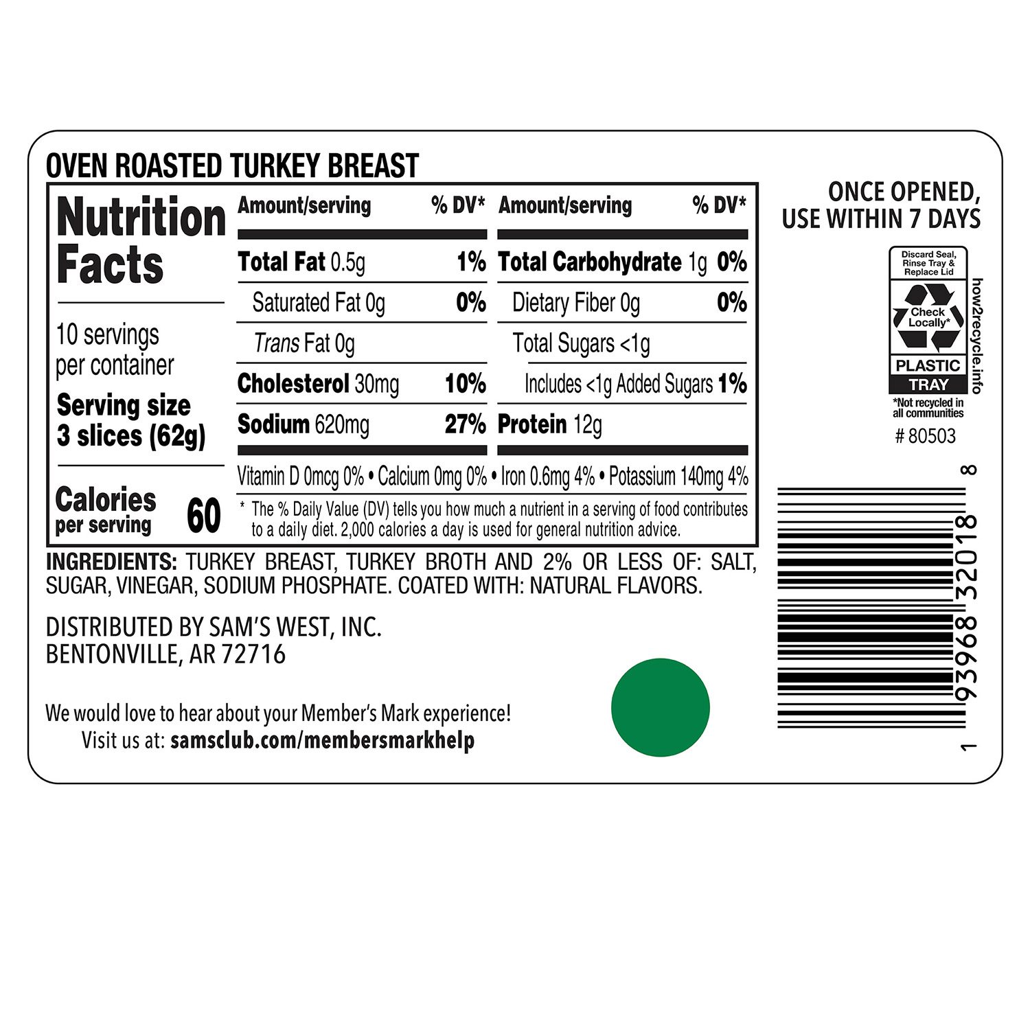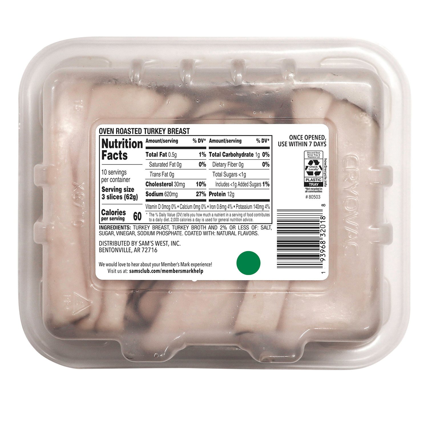 Member's Mark™ Oven Roasted Turkey Breast tastes terrific on sandwiches, salads, casseroles and more. This delicious sliced turkey is made from whole turkey breast and contains no artificial flavors or colors. It's also made without nitrites or nitrates and is 98% fat free. The sliced turkey is packaged in a new resealable container for easy storage and food prep. There are 10 servings per 22-ounce container.