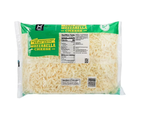 This bag of shredded part-skim mozzarella cheese is the right size for creating large batches of food. It's excellent for use by hotels, caterers, restaurants, cafeterias and other foodservice operations. The 5-lb. bag of shredded mozzarella makes it a breeze to create meals or appetizers for numerous guests. Use it while cooking for events such as weddings, receptions, luncheons, retirement parties and more. This Member's Mark Part-Skim Shredded Mozzarella Cheese is also fantastic for home use when making weekly meals or special dinners with the family. Have it on hand for producing satisfying dishes anytime.