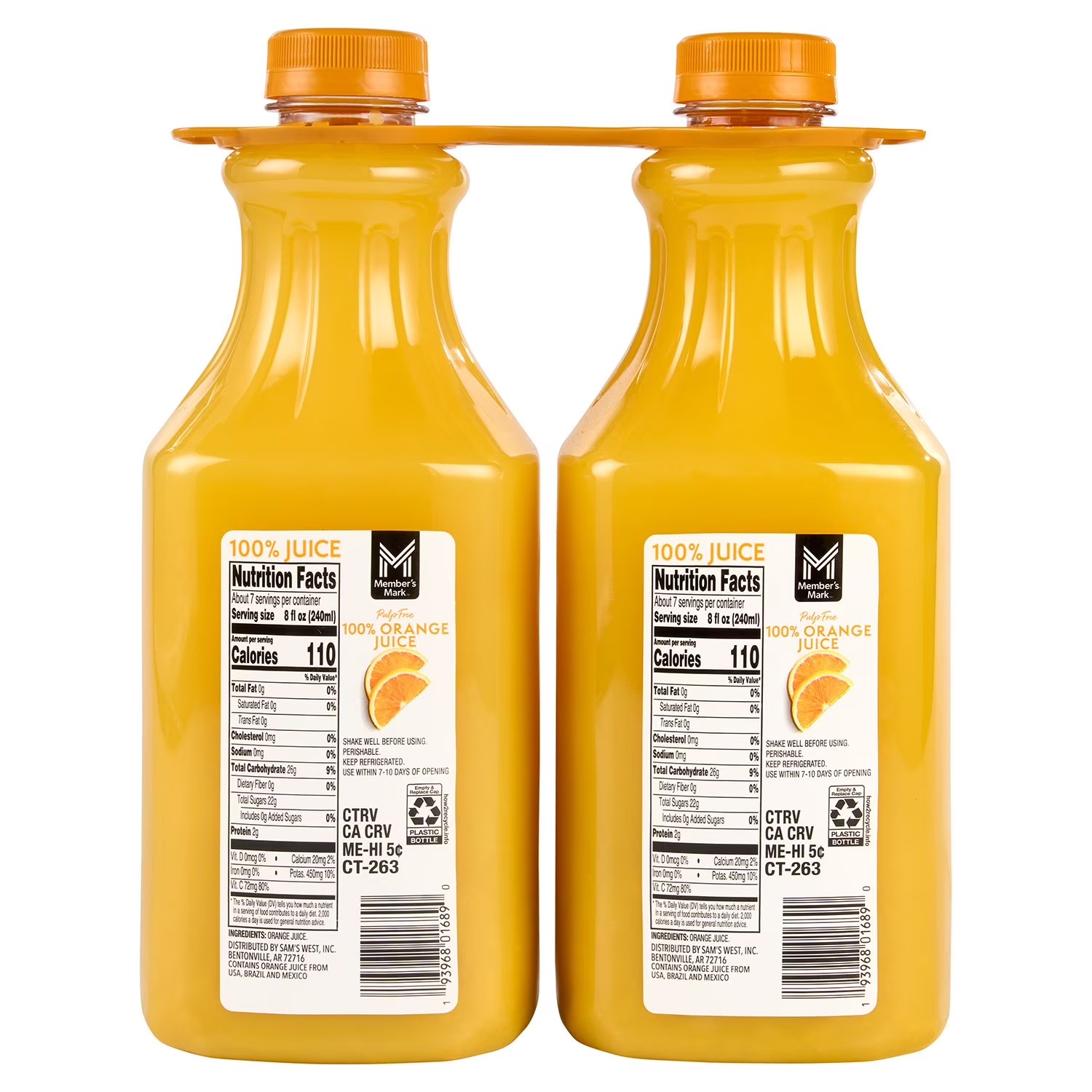 Member's Mark Pulp-Free 100% Orange Juice, 52 fl. oz., 2 pk. is not from concentrate and has no preservatives or added sugars. The orange juice is non-GMO and gluten-free with an excellent source of vitamin C. Drink this 100% orange juice as is or use it in your favorite cocktails. Two 52-ounce bottles ensure there will be enough to go around for the entire family! Both kids and adults will love the great, fresh-squeezed taste.