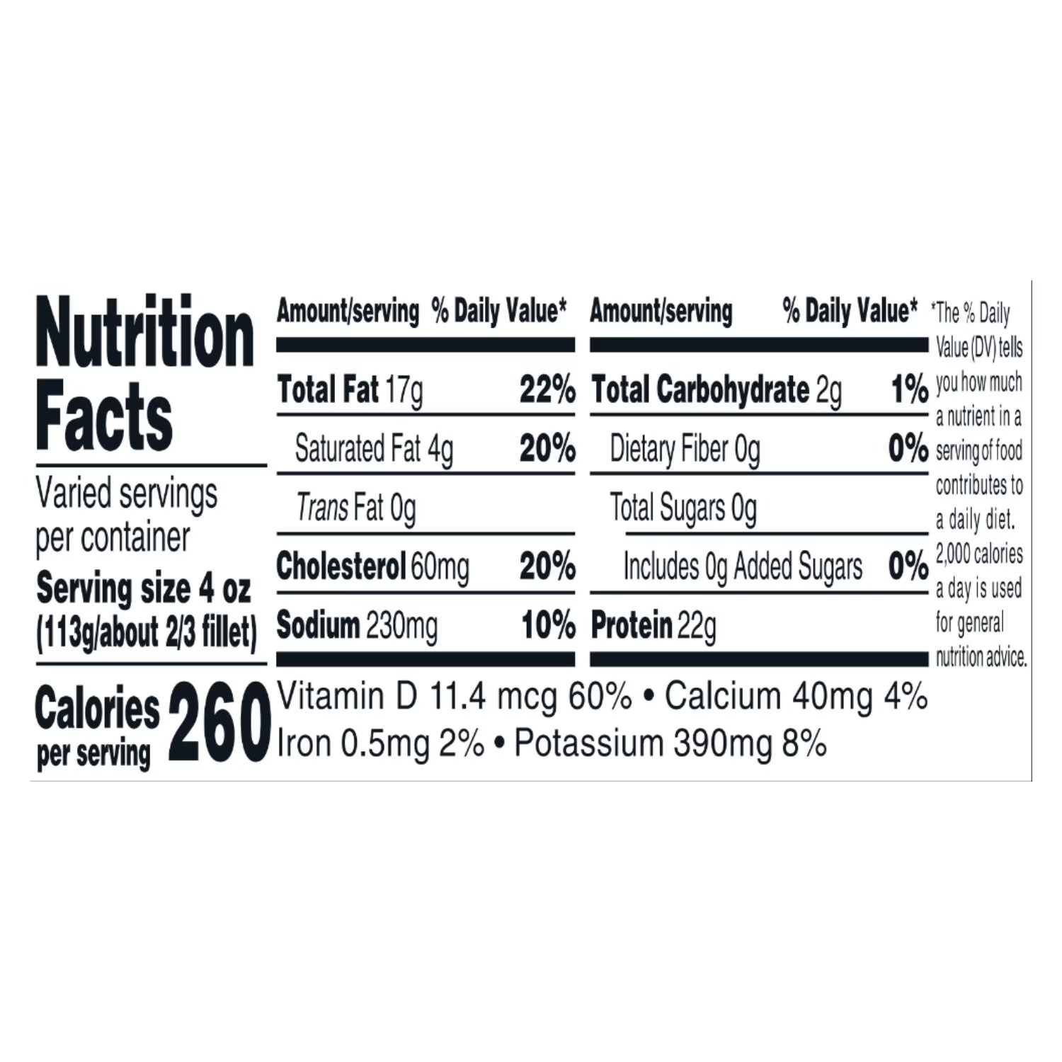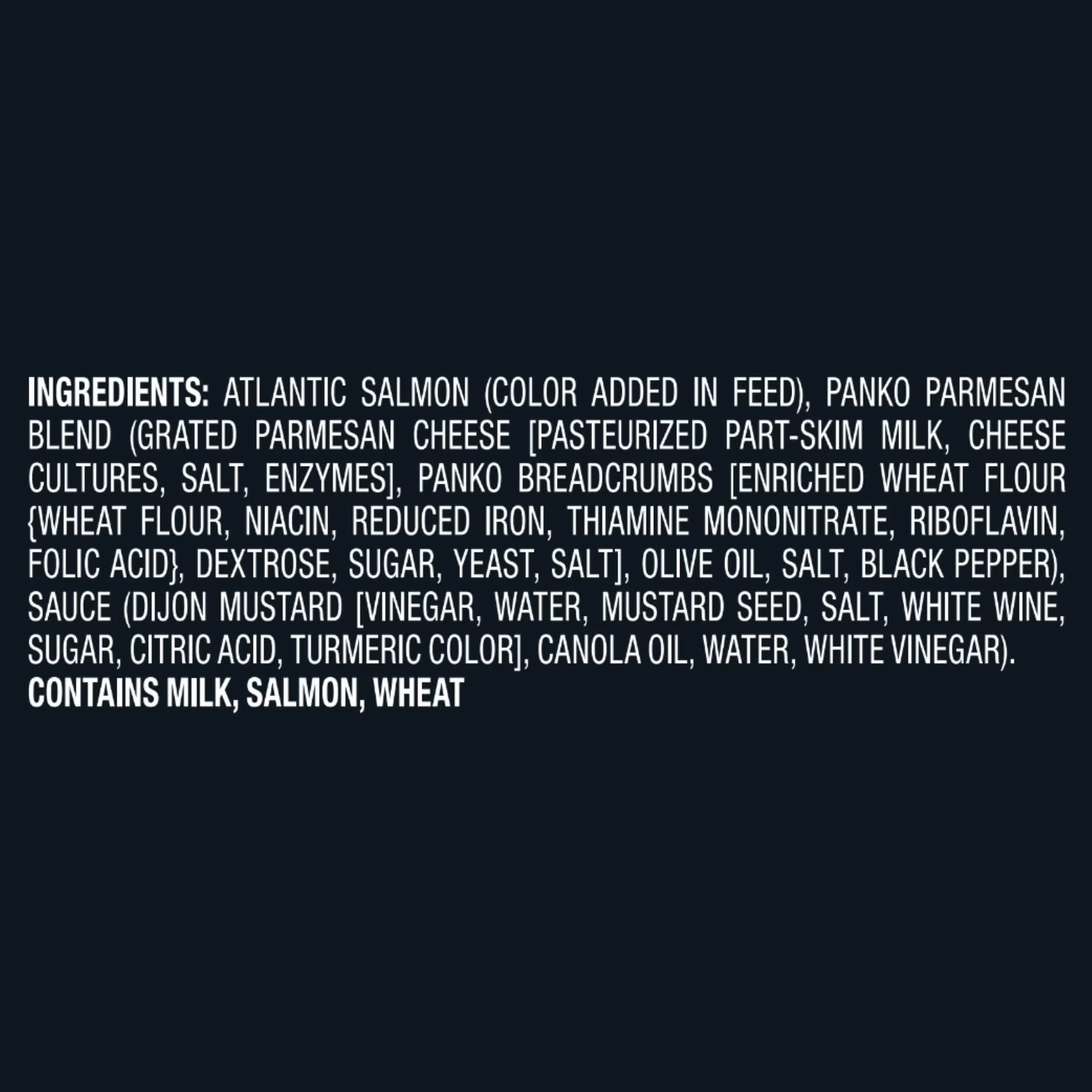 Ingredients: Atlantic Salmon (Color Added In Feed), Panko Parmesan Blend (Grated Parmesan Cheese [Pasteurized Part-skim Milk, Cheese Cultures, Salt, Enzymes], Panko Breadcrumbs [Enriched Wheat Flour {Wheat Flour, Niacin, Reduced Iron, Thiamine Mononitrate, Riboflavin, Folic Acid}, Dextrose, Sugar, Yeast, Salt], Olive Oil, Salt, Black Pepper), Sauce (Dijon Mustard [Vinegar, Water, Mustard Seed, Salt, White Wine, Sugar, Citric Acid, Turmeric Color], Canola Oil, Water, White Vinegar).