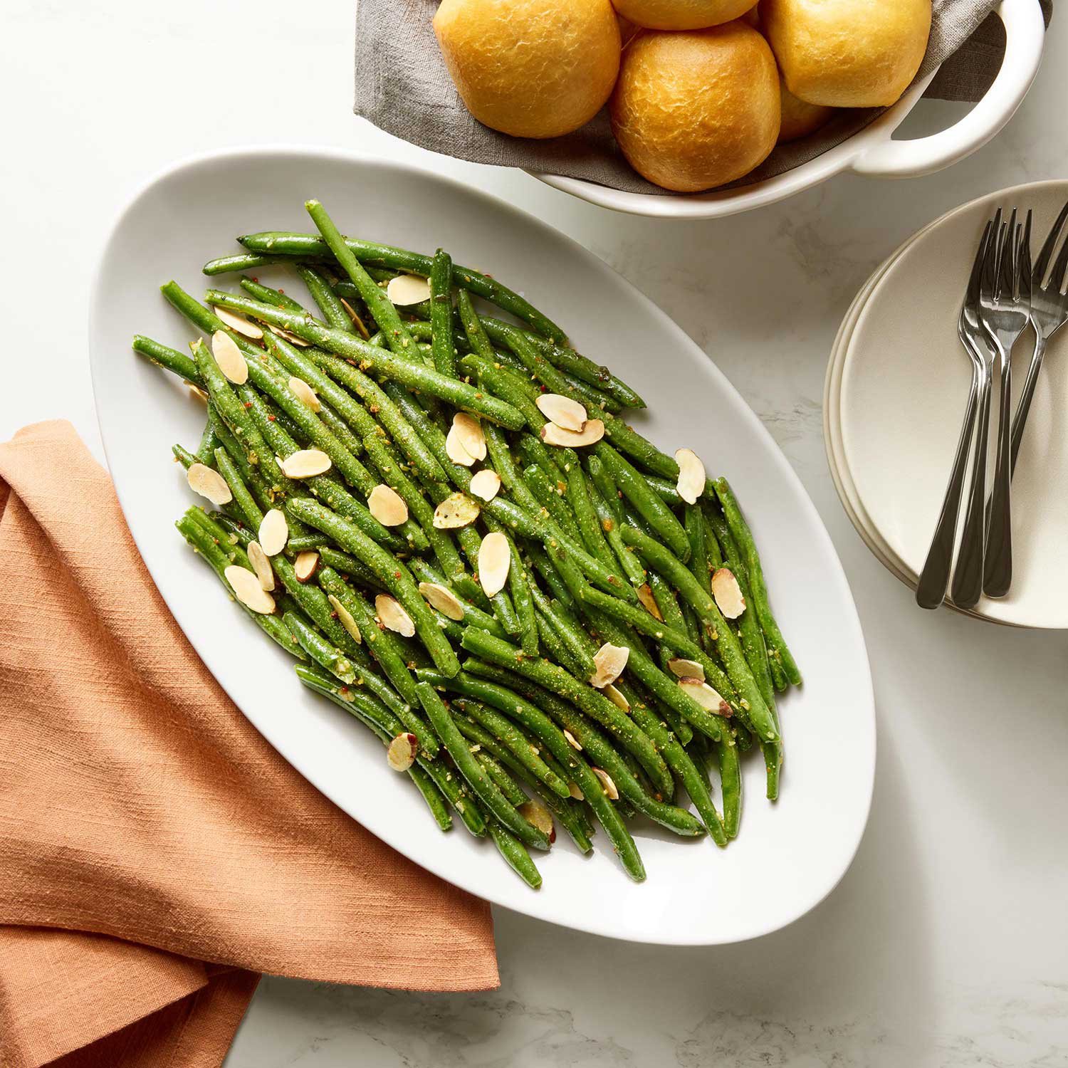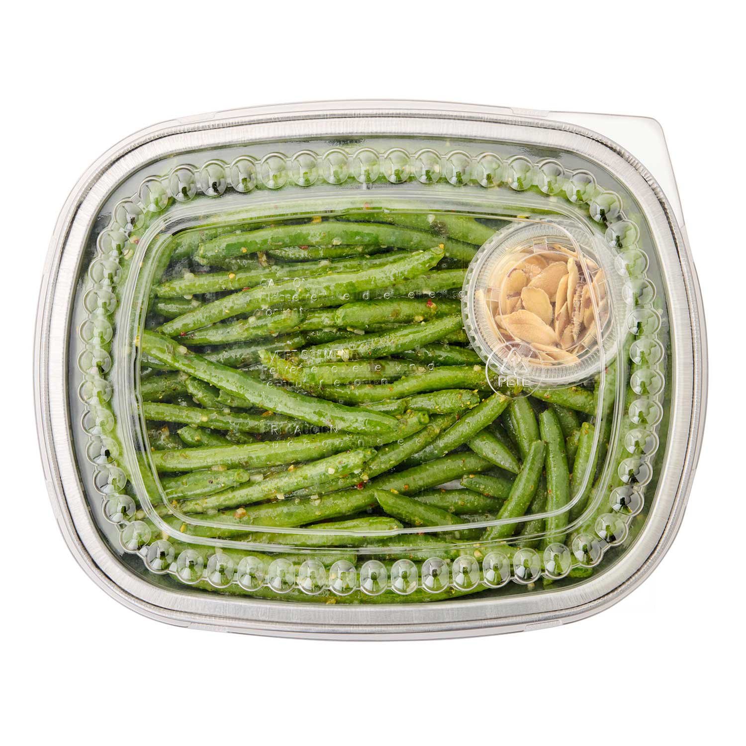 Ingredients: Green Beans, Basil Garlic Oil Blend (Vegetable Oil [Canola Oil And/Or Soy Oil], Water, Extra Virgin Olive Oil, Basil, White Balsamic Vinegar, Dried Garlic, Salt, Less Than 2% of Sugar, Phosphoric Acid, Xanthan Gum, Spice), Sliced Almonds, Butter Flavored Seasoning (Salt, Dehydrated Onion, Dehydrated Garlic, Spices, Red Bell Pepper, Dextrose, Parsley, Maltodextrin, Yeast Extract, Sunflower Oil, Natural Butter Flavor, Turmeric Extract [Color], Natural Flavor).