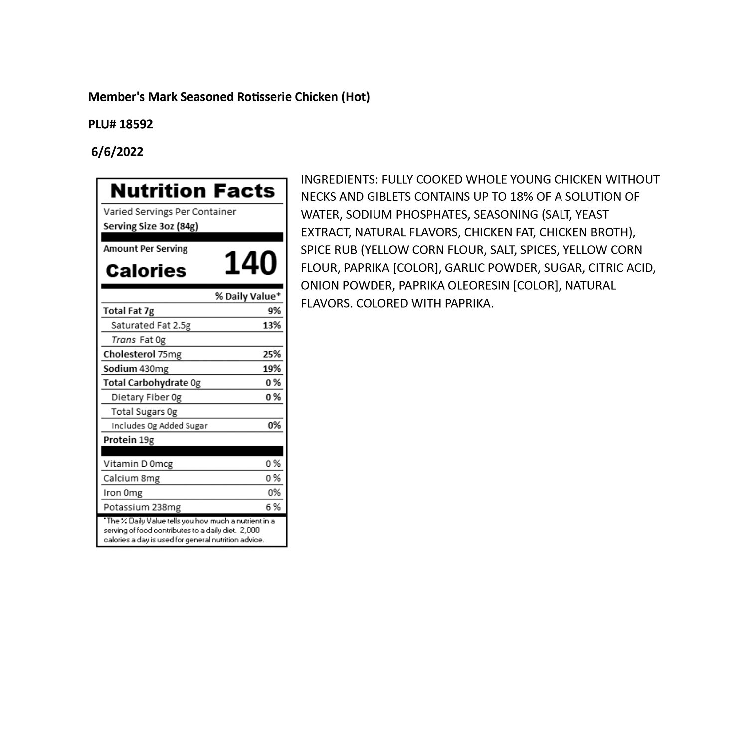 | Ingredients: | Fully Cooked Whole Young Chicken Without Necks and Giblets, Contains Up to 18% of a Solution of Water, Sodium Phosphates, Seasoning (Salt, Yeast Extract, Natural Flavors, Chicken Fat, Chicken Broth), Spice Rub (Yellow Corn Flour, Salt, Spices, Yellow Corn Flour, Paprika [Color], Garlic Powder, Sugar, Citric Acid, Onion Powder, Paprika Oleoresin [Color], Natural Flavors, Colored with Paprika). |