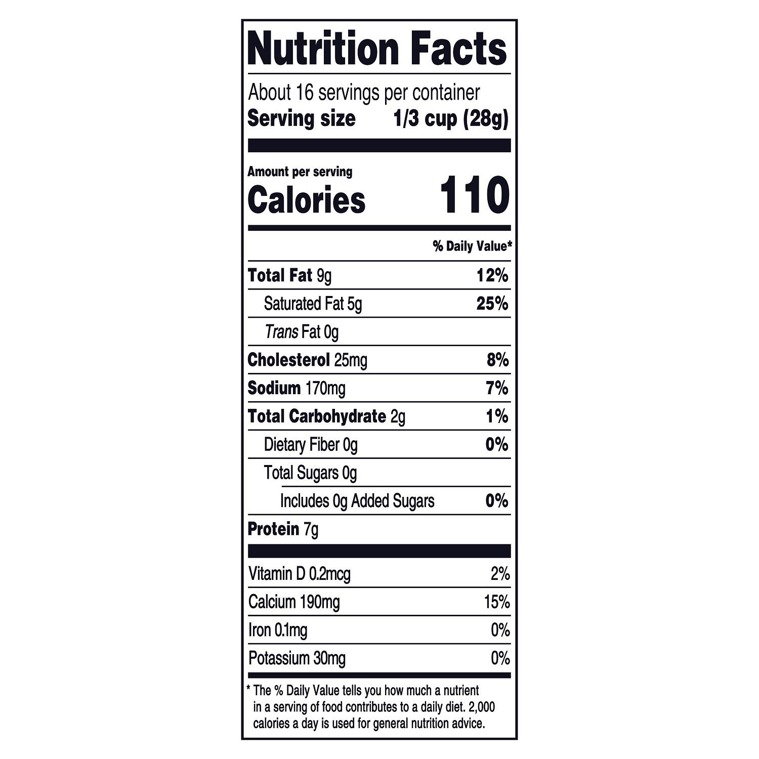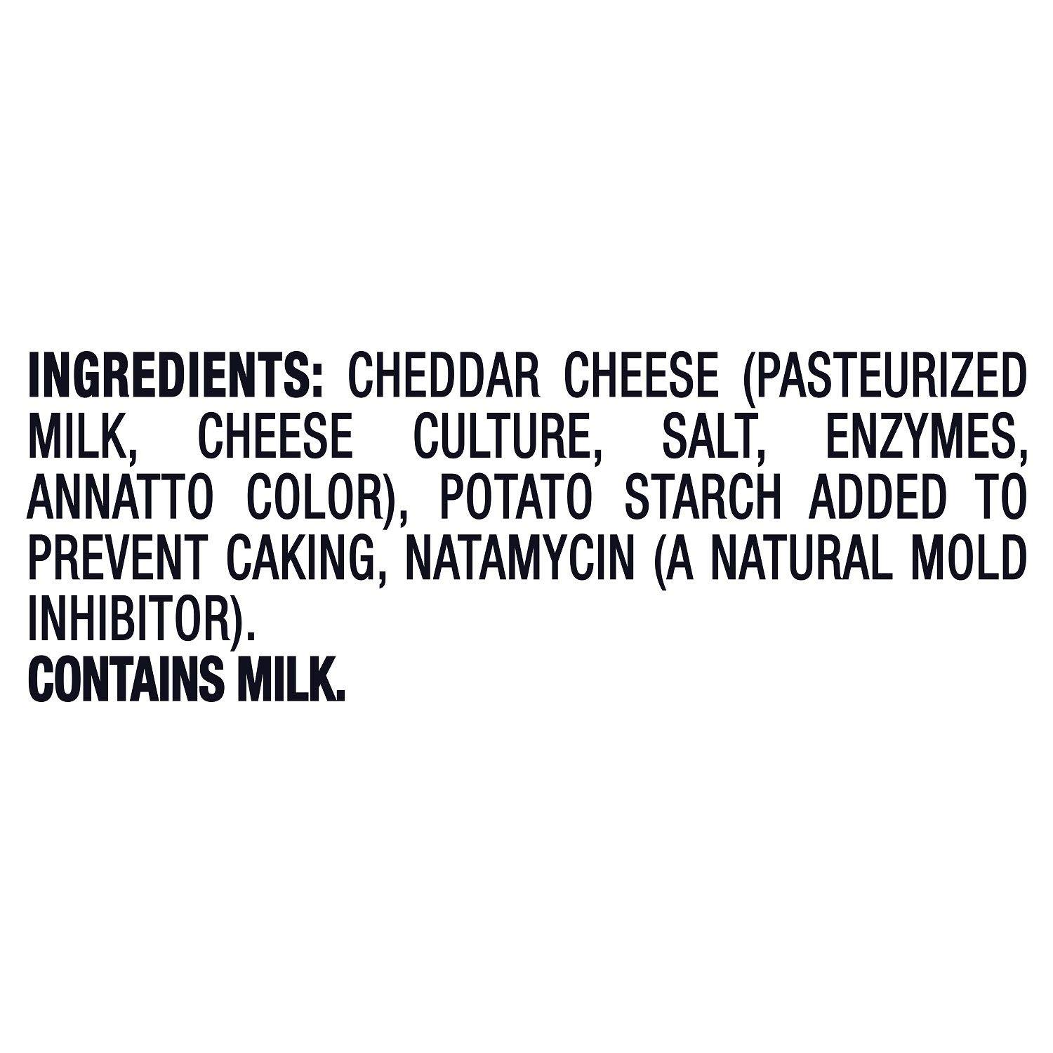 Cheddar cheese (pasteurized milk, cheese culture, salt, enzymes, annatto color), potato starch added to prevent caking, natamycin (a natural mold inhibitor)