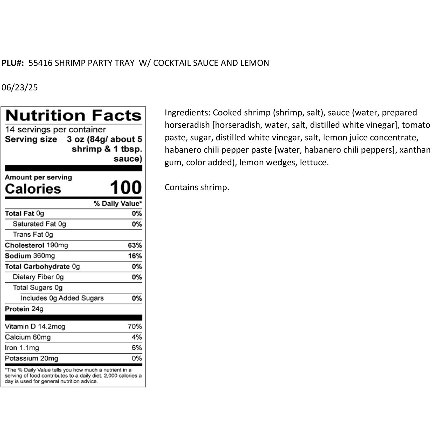 Ingredients: Shrimp (Shrimp, Salt), Sauce (Water, Prepared Horseradish [Horseradish, Water, Salt, Distilled White Vinegar], Tomato Paste, Sugar, Distilled White Vinegar, Salt, Lemon Juice Concentrate, Habanero Chili Pepper Paste (Water, Habanero Chili Peppers), Xanthan Gum, Color Added), Lemon Wedges, Lettuce.
