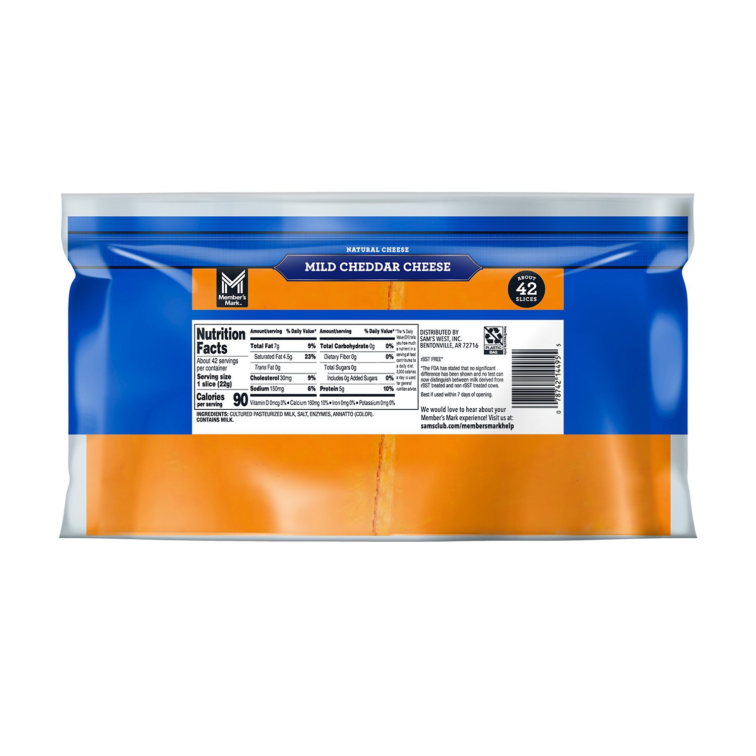 You can feel good about the ingredients used in Member’s Mark cheddar cheese. It’s made with rBST- and rBGH-free cow's milk. Each slice only has 80 calories but contains five grams of protein and 15% of a daily serving of calcium, making it quite nutritious. Eat it on its own to add to your health or add it to a variety of dishes.