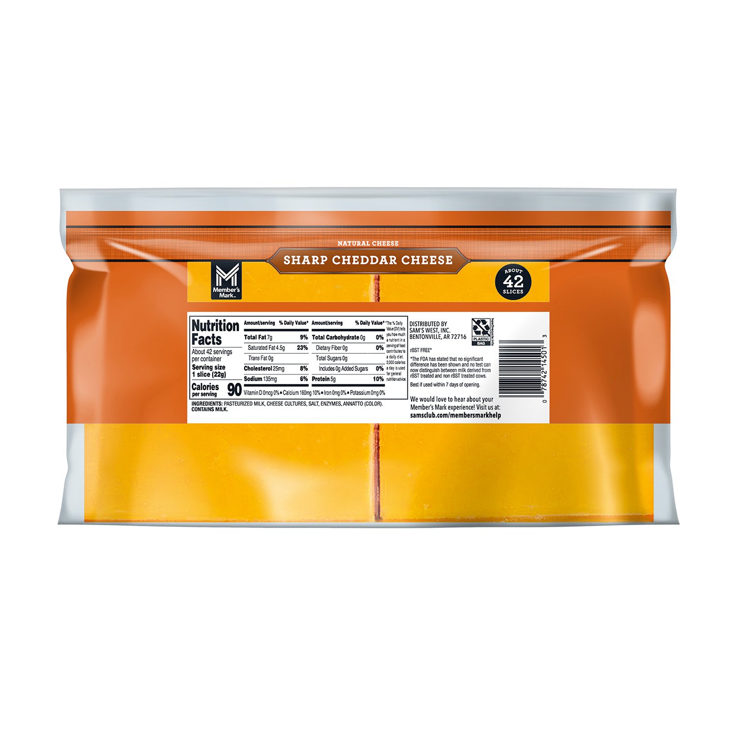 Member's Mark Sliced Sharp Cheddar has a slightly crumbly texture and a rich & nutty yet strong, biting flavor. It is outstanding on toasted bread with turkey or served with crisp, sweet bell peppers. Made with rBGH-free cow's milk, so you can feel good about feeding it to your family. This 2-lb. package is resealable and contains approximately 42 slices of delicious sharp cheddar cheese.