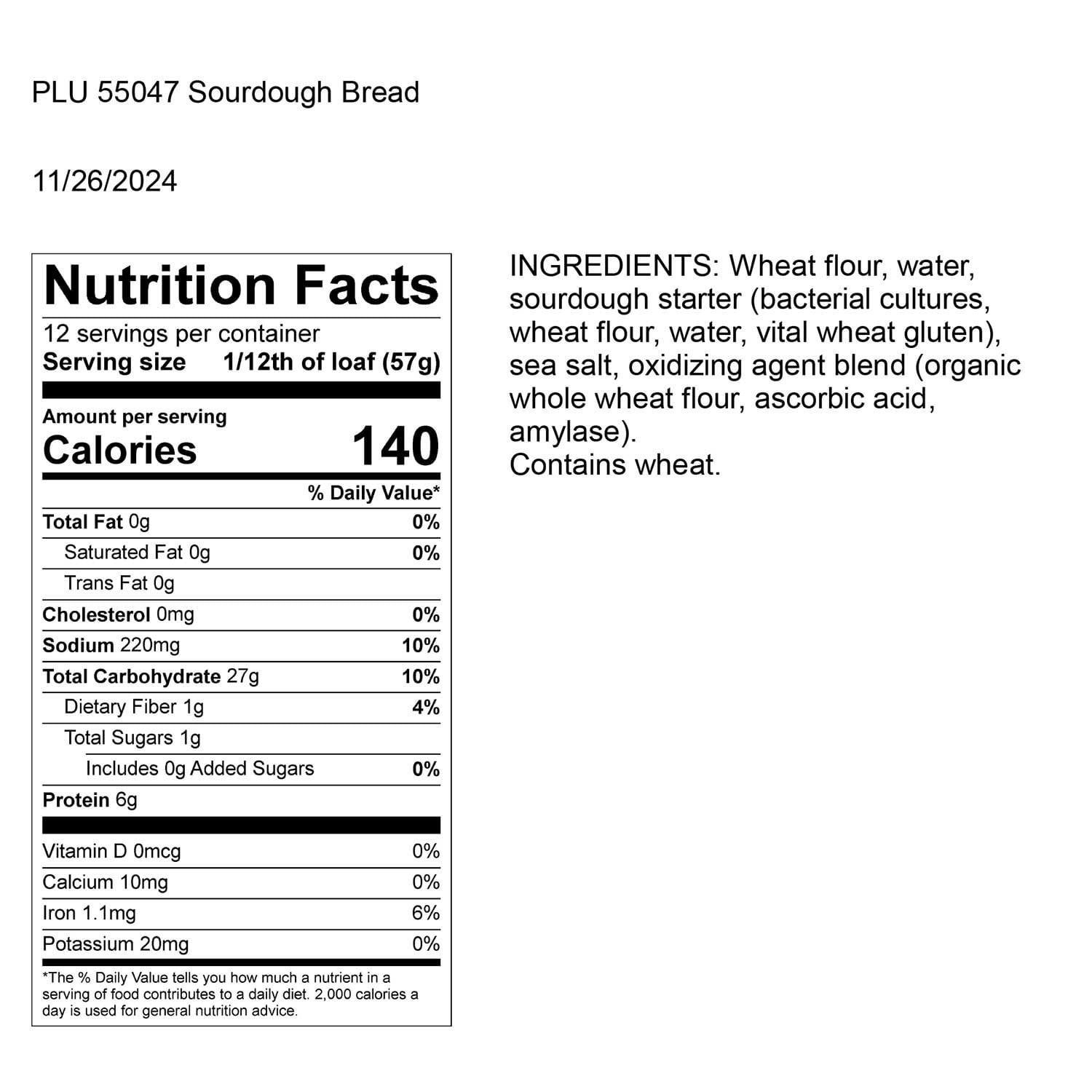 Ingredients: Wheat Flour, Water, Sourdough Starter (Bacterial Cultures, Wheat Flour, Water, Vital Wheat Gluten), Sea Salt, Oxidizing Agent Blend (Organic Whole Wheat Flour, Ascorbic Acid, Amylase).