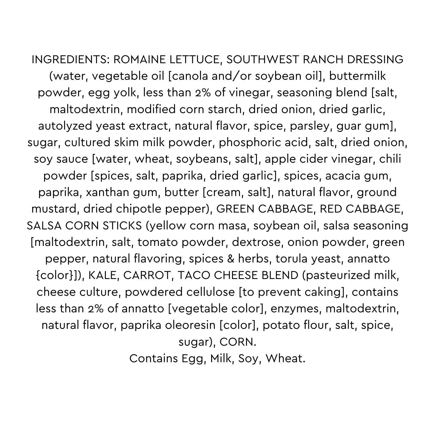 Ingredients: Romaine Lettuce, Mild Southwest Ranch Dressing (Water, Canola Oil, Buttermilk Powder, Egg Yolk, Less Than 2% Of Distilled Vinegar, Seasoning Blend [Salt, Maltodextrin, Modified Food Starch, Dried Onion, Dried Garlic, Autolyzed Yeast Extract, Natural Flavor, Spice, Parsley, Guar Gum], Sugar, Cultured Skim Milk Powder, Salt, Dried Onion, Soy Sauce [Water, Wheat, Soybeans, Salt], Apple Cider Vinegar, Chili Powder [Spices, Salt, Paprika, Dried Garlic], Spices, Acacia Gum, Paprika, Xanthan Gum, Butter [Cream, Salt], Natural Flavor, Mustard Flour, Dried Chipotle Pepper, Phosphoric Acid), Red Cabbage, Green Cabbage, Salsa Corn Sticks (Yellow Corn Masa, Soybean Oil, Salsa Seasoning [Maltodextrin, Salt, Tomato Powder, Dextrose, Onion Powder, Green Pepper, Natural Flavor, Spices, Torula Yeast, Annatto Extract (Color)]), Kale, Carrots, Seasoned Cheese Blend (Pasteurized Milk, Cheese Culture, Powdered Cellulose (To Prevent Caking), Contains Less Than 2% Of Annatto Extract (Color), Enzymes, Maltodextrin, Natural Flavor, Paprika Oleoresin (Color), Potato Flour, Salt, Spice, Sugar), Freeze Dried Corn.