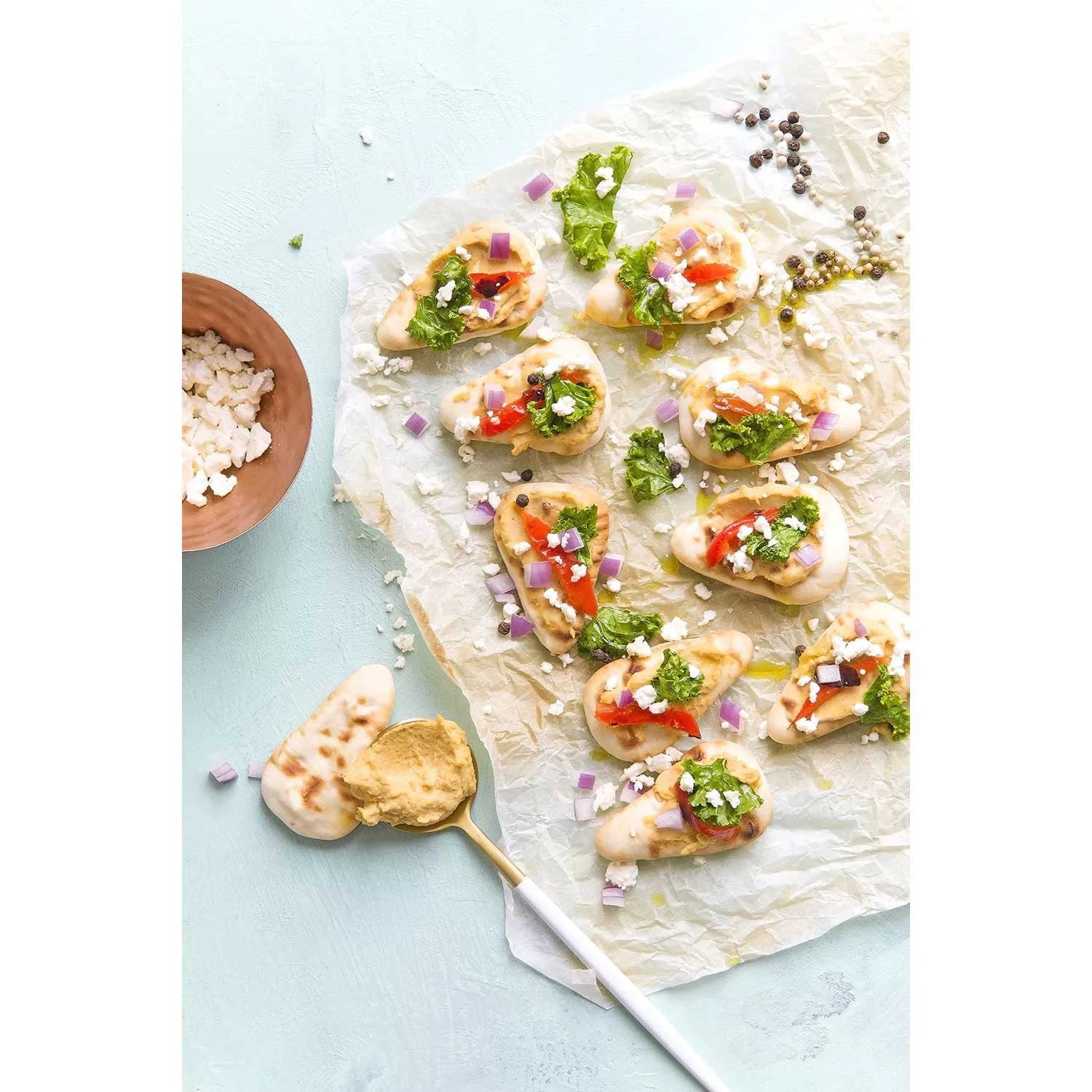 - Spread hummus over slightly cooled Naan Bites; add onion, red pepper, kale, and feta cheese. Add black pepper / red pepper flakes and garnish with fresh parsley if desired.