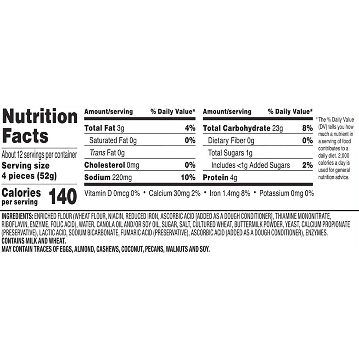 Ingredients: Enriched flour (wheat flour, niacin, reduced iron, ascorbic acid added as a dough conditioner, thiamine mononitrate, riboflavin, enzyme, folic acid), water, canola oil and/or soy oil, sugar, salt, buttermilk powder, culture wheat, yeast, calcium propionate (preservative), lactic acid, sodium bicarbonate, fumaric acid (preservative), ascorbic acid added as a dough conditioner, enzymes.