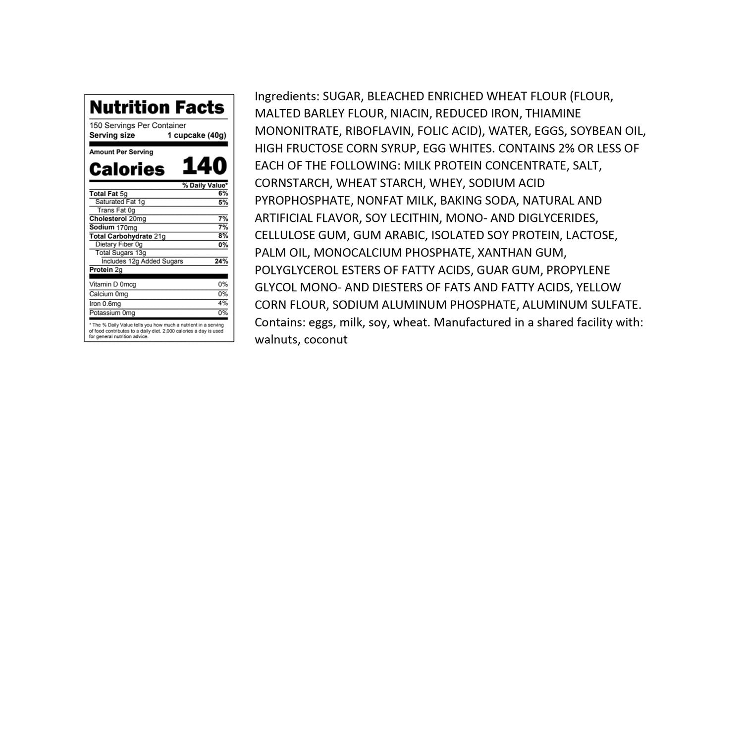 The Member's Mark Un-Iced White Cupcakes, Bulk Wholesale Case offers the option to stock up on vanilla cupcakes for large events, catering, bakeries, restaurants, or other food service locations. Each cupcake comes without icing so you can decorate them however you would like. These un-iced white cupcakes allow you to turn them into magical creations and let your culinary imagination run wild. Add different frosting flavors for added texture and flavor. Serve some at your next party or keep them on hand for dessert or anytime treats. These yummy treats are sure to please everyone’s sweet tooth!