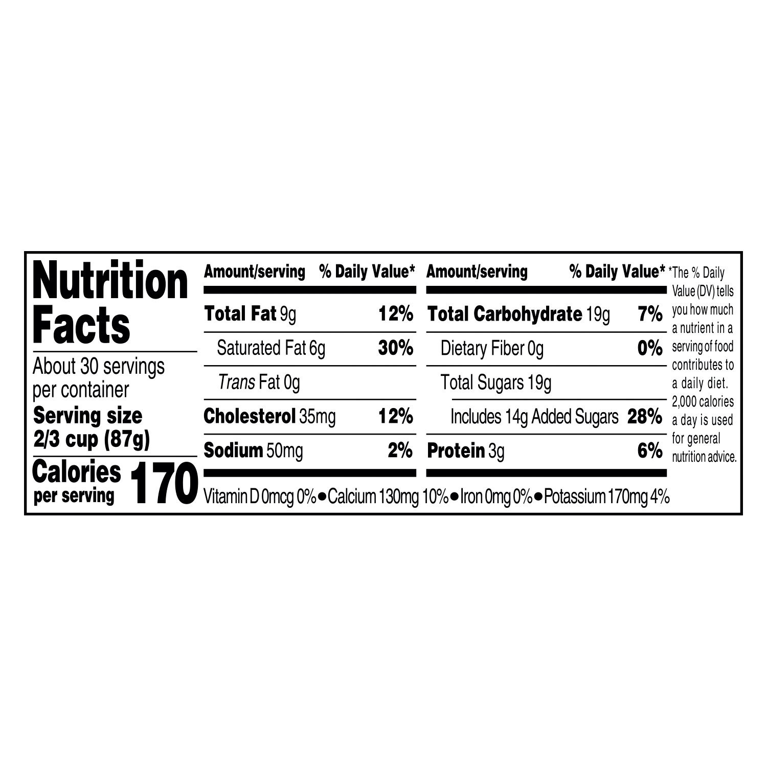 Ingredients: Milkfat, Nonfat Milk, High Fructose Corn Syrup, Sugar, Corn Syrup, Whey, Stabilizer Blend (Mono and Diglycerides, Guar Gum, Cellulose Gum, Carrageenan, Maltodextrin), Natural and Artificial Vanilla Flavor, Annatto Extract Color.