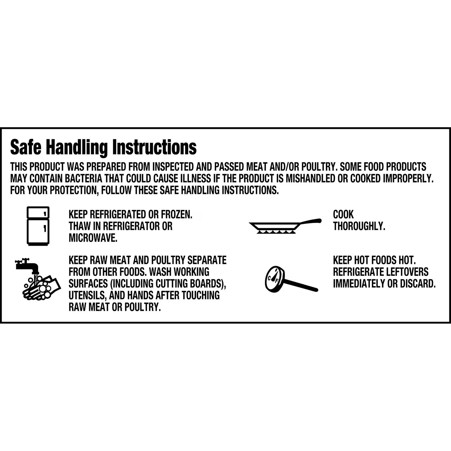 Safe Handling: This product was prepared from inspected and passed meat and/or poultry. Some food products may contain bacteria that could cause illness if the product is mishandled or cooked improperly. For your protection, follow these safe handling instructions. Keep refrigerated or frozen. Thaw in refrigerated or microwave. Keep raw meat and poultry separate from other foods. Wash working surfaces (including cutting boards), utensils, and hands after touching raw meat or poultry. Cook thoroughly. Keep hot foods hot. Refrigerate leftovers immediately or discard.