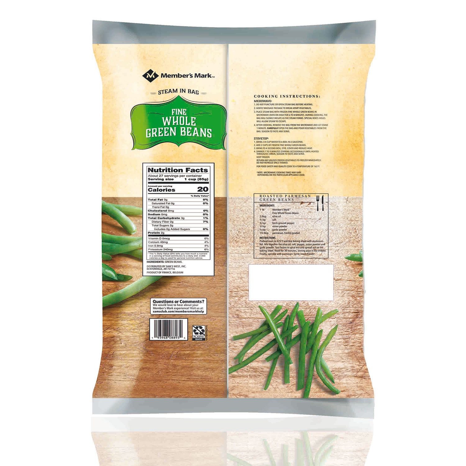 Member's Mark Whole Green Beans are individually quick-frozen, locking in fresh vegetable taste, texture and nutrients. These wholesome, all-natural green beans are a fantastic side dish for busy folks, and come in a steamable bag for easy prep. Cook them in the microwave for 6-8 minutes or on the stove top for 7-9 minutes; they'll turn out delicious either way. Roasted Parmesan Green Beans recipe on the back of package.