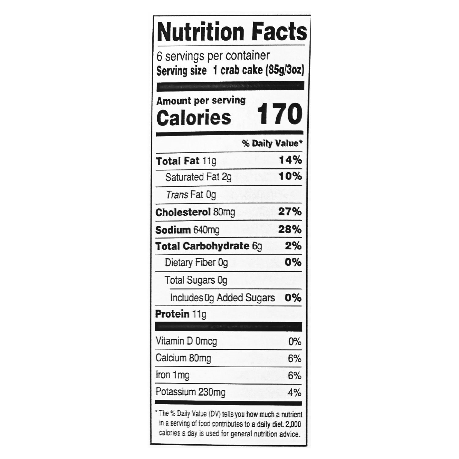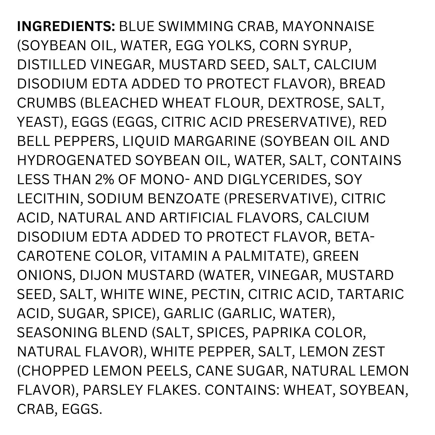 Ingredients: Blue Swimming Crab, Mayonnaise (Soybean Oil, Water, Egg Yolks, Corn Syrup, Distilled Vinegar, Mustard Seed, Salt, Calcium Disodium Edta Added To Protect Flavor), Bread Crumbs (Bleached Wheat Flour, Dextrose, Salt, Yeast), Eggs (Eggs, Citric Acid Preservative), Red Bell Peppers, Liquid Margarine (Soybean Oil And Hydrogenated Soybean Oil, Water, Salt, Contains Less Than 2% Of Mono- And Diglycerides, Soy Lecithin, Sodium Benzoate (Preservative), Citric Acid, Natural And Artificial Flavors, Calcium Disodium Edta Added To Protect Flavor, Beta-carotene Color, Vitamin A Palmitate), Green Onions, Dijon Mustard (Water, Vinegar, Mustard Seed, Salt, White Wine, Pectin, Citric Acid, Tartaric Acid, Sugar, Spice), Garlic (Garlic, Water), Seasoning Blend (Salt, Spices, Paprika Color, Natural Flavor), White Pepper, Salt, Lemon Zest (Chopped Lemon Peels, Cane Sugar, Natural Lemon Flavor), Parsley Flakes.
