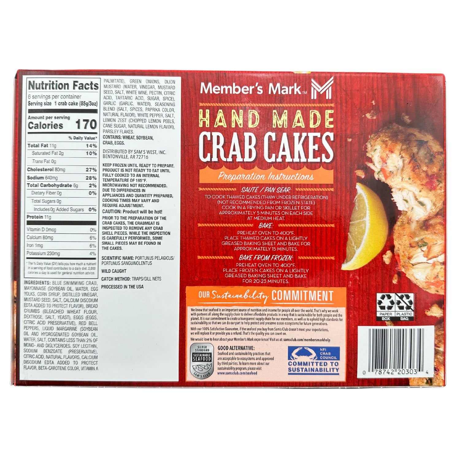 Member's Mark Wild Caught Handmade Crab Cakes, Frozen, 6 ct. are made from freshly caught crabmeat and feature a delicious panko breading. When you can’t visit the Gulf Coast, these easy crab cakes are the next best thing. Pop them in the oven and serve the whole family fine dining quality crab cakes. Each crab cake is made in a small batch to ensure the highest consistency and a homemade experience.