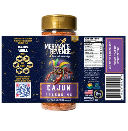 Merman’s Revenge Cajun Style Seasoning is a full-bodied, flavorful Cajun seasoning blend crafted in Florida and inspired by the rich, spicy traditions of Louisiana Cajun cooking. Made with Cajun spices and a hint of Fresh From Florida oranges, this medium-heat Cajun seasoning brings a vibrant kick to seafood boils, shrimp boils, blackened fish, Cajun pasta, gumbo, and more. It’s also the perfect Cajun spice blend for fish, BBQ shrimp, turkey, and grilled meats. Try it on everyday favorites like chicken wings and eggs to add a flavorful twist.
