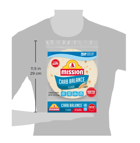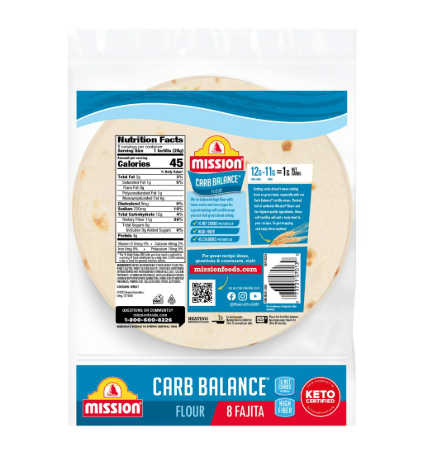 Mission Carb Balance Fajita Flour Tortillas have the super soft texture and great taste you want in a tortilla, but without all of the carbs you don't. You can feel good about using our tortillas in any of your homemade recipes because they contain only 1g of net carbs and zero sugar per serving. Our flour tortillas are also an excellent source of dietary fiber. Versatile enough for any low carb recipe, our tortillas help you feel balanced to the extreme. Try our tortillas filled with sliced turkey, sharp cheddar, and apple-arugula salad for an easy dinner everyone will love. Includes one 8 count package of Mission Carb Balance Fajita Flour Tortillas.