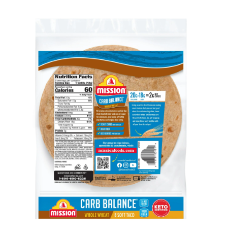Mission Carb Balance Soft Taco Whole Wheat Tortillas have the supremely soft texture and great taste you want, but without all the carbs you don't. You can feel good about serving our tortillas to your friends and family because they contain 2g of net carbohydrates and zero sugar per serving. They're also cholesterol free and are an excellent source of dietary fiber. Whether you’re seeking a balanced diet or enjoy experimenting with new ingredients, our extreme low carb tortillas are versatile enough to use in all of your favorite recipes. We recommend filling them with grilled salmon, mashed avocado, and fresh arugula for a quick and delicious dinner. Includes one 8-count package of Mission Carb Balance Soft Taco Whole Wheat Tortillas.