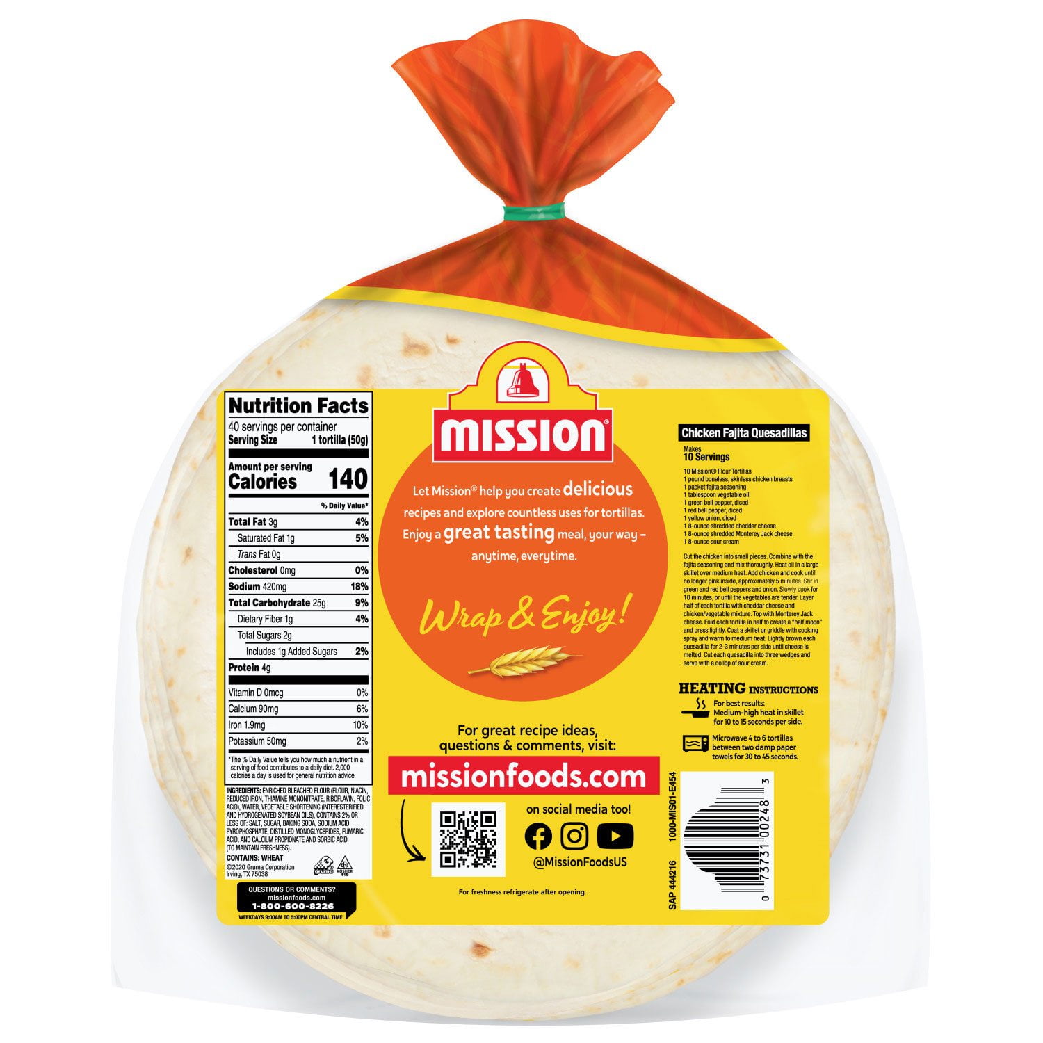 This package of Mission Medium Flour Soft Taco Tortillas contains 40 tortillas. With the resealable bag, you can use them for several different meals or one large party.
