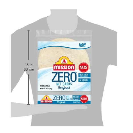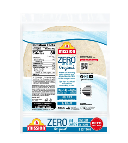 New Mission Zero Net Soft Taco size Tortillas have the super soft texture and great taste you want in a tortilla, but without all of the carbs you don't. Now in a larger size. You can feel good about using our tortillas in any of your homemade recipes because they contain 0g of net carbs and zero sugar per serving. Our zero net carb tortillas are also keto certified. Versatile enough for any low carb recipe, our tortillas help you feel balanced to the extreme. Try our tortillas filled with sliced turkey, sharp cheddar, and apple-arugula salad for an easy dinner everyone will love. Includes one 8ct package of Mission Zero Net Original Tortillas.