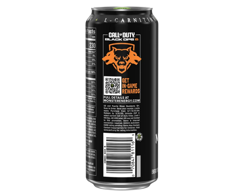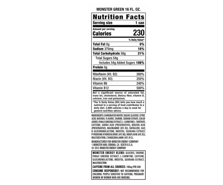 Carbonated Water, Sugar, Glucose, Citric Acid, Natural Flavors, Taurine, Sodium Citrate, Color Added, Panax Ginseng Extract, L-Carnitine L-Tartrate, Caffeine, Sorbic Acid (Preservative), Benzoic Acid (Preservative), Niacinamide (Vit. B3), Sucralose, Salt, D-Glucuronolactone, Inositol, Guarana Extract, Pyridoxine Hydrochloride (Vit. B6), Riboflavin (Vit. B2), Maltodextrin, Cyanocobalamin (Vit. B12). Monster Energy Blend: Glucose, Taurine, Panax Ginseng Extract, L-Carnitine, Caffeine, Glucuronolactone, Inositol, Guarana Extract, Maltodextrin.