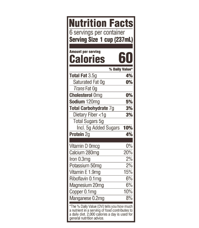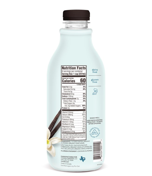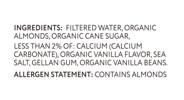 Filtered Water, Organic Almonds, Organic Cane Sugar, Less than 2% of: Calcium (Calcium Carbonate), Organic Vanilla Flavor, Sea Salt, Gellan Gum, Organic Vanilla Beans.