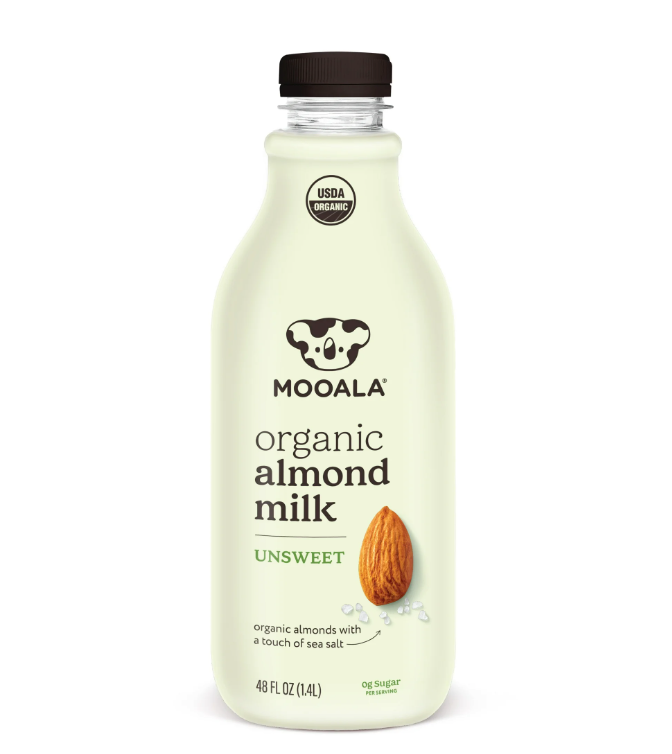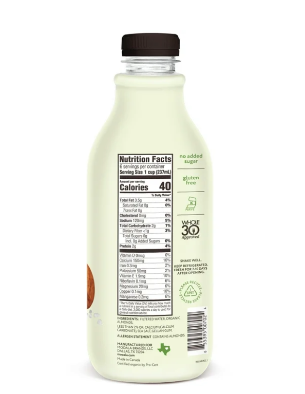 Mooala Unsweetened Almond Milk is organic, unsweetened, creamy and delicious. Organic CAN taste good! Free from harmful pesticides and made with no added sugar. Use it in recipes as a straight replacement for dairy milk. Carrageenan free. USDA organic. Vegan-friendly. 5 ingredients. 0g sugar per serving. Free of synthetic vitamins. Free of dairy, lactose, soy, gluten, and carrageenan. Comes in refrigerated 48oz bottles.