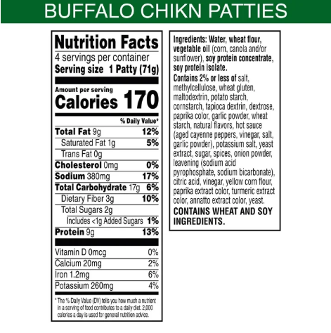 - Includes one, 10oz resealable bag containing four frozen MorningStar Farms Buffalo meatless chicken patties; Packaged for freshness and great taste