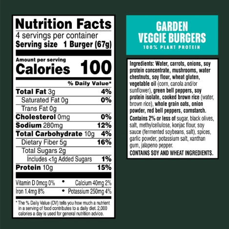 - Includes 1, 9.5oz resealable bag containing 4 frozen Garden Veggie vegan burgers; Packaged for freshness and great taste